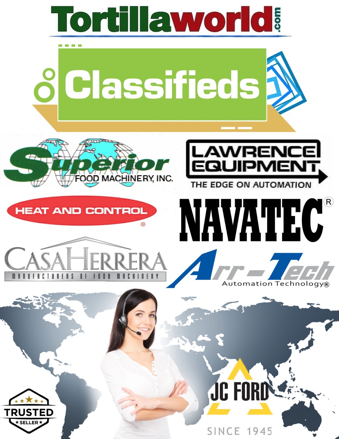 Since its founding in 2012 Tortillaworld.com has become a leader in the tortilla, wraps, flat-bread, chapatti and snack Industry by building a growing reputation of having the world’s largest most comprehensive online selection of new/used American made industrial name brand tortilla manufacturing equipment proven reliable and durable by industry professionals and decision makers worldwide. We offer premium quality ingredients (corn, corn flour, lime, softener’s, preservatives, etc.) Original replacement parts (volcanic lava stone sets, sheeter head rollers, corn tortilla die cutters, music wire, roller bands, etc.) premium quality industrial food grade high temperature and NSF registered lubricants (liquid silicone, grease, high temp. spray lubricant, synthetic and traditional black graphite chain lubricant etc.) all designed to help the tortilla industry improve their production efficiency. We service restaurants, supermarket, low and high production factory’s that help supply the growing demand of fresh corn and flour tortillas, chips & other tortilla products                                            Tortillaworld classifieds: