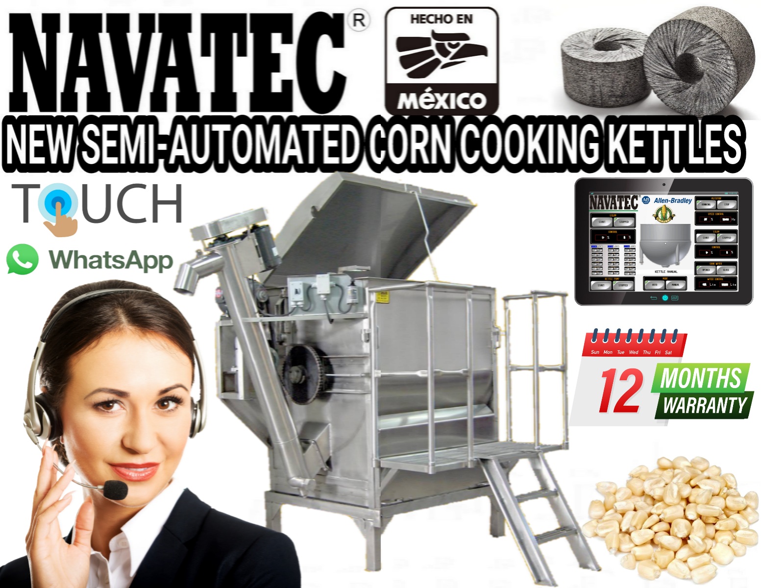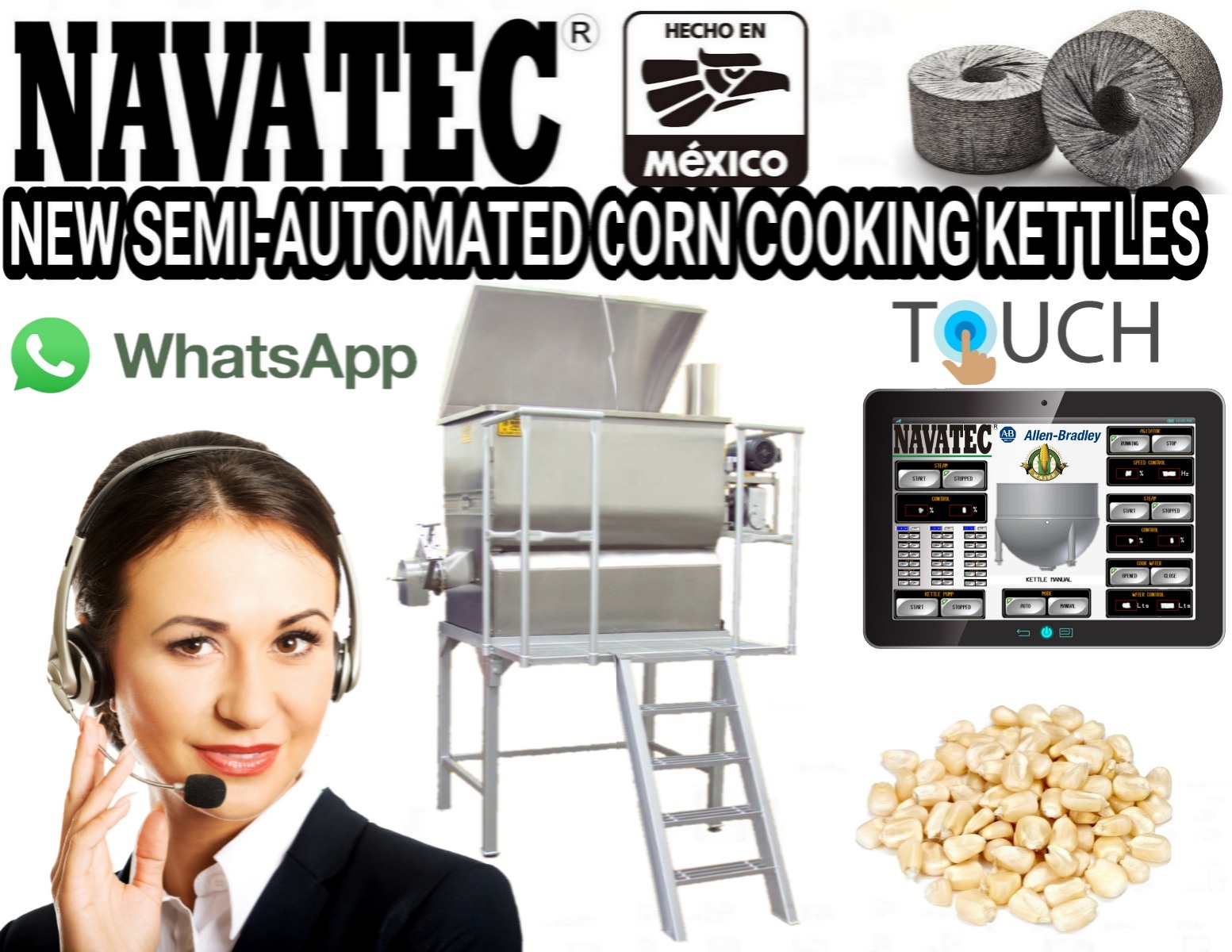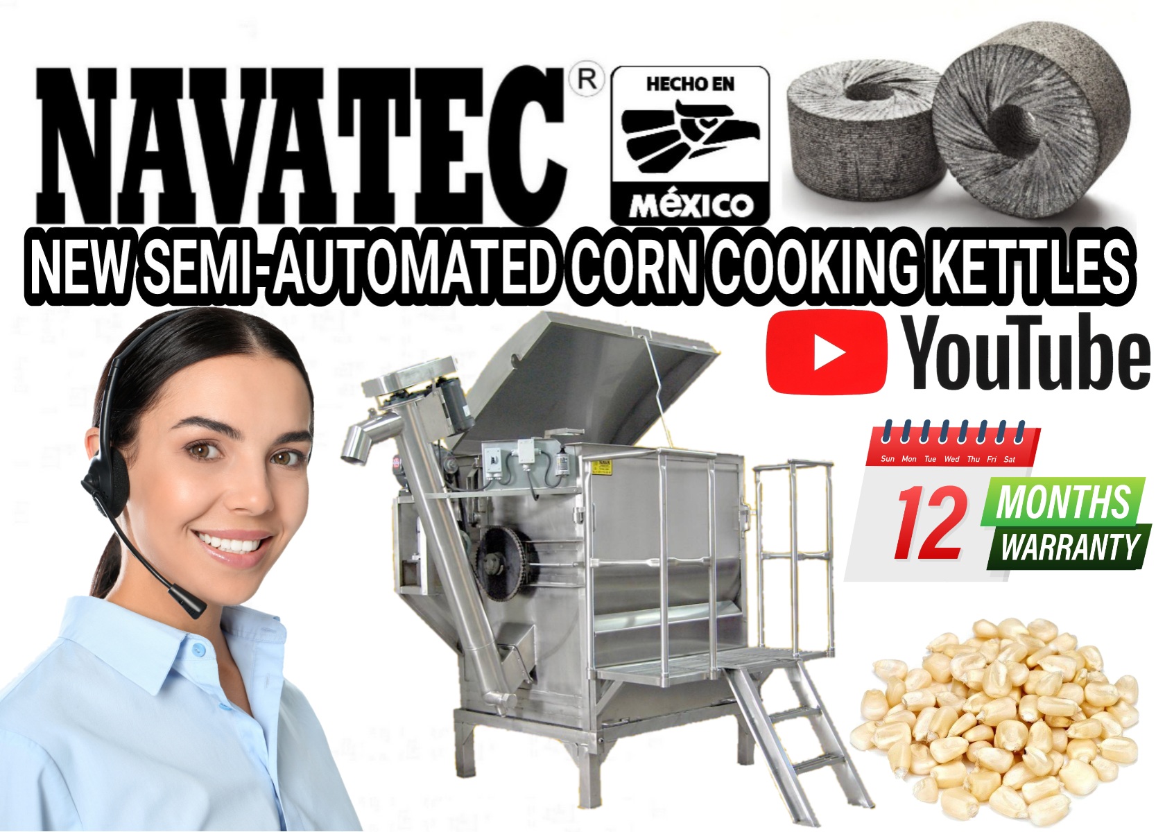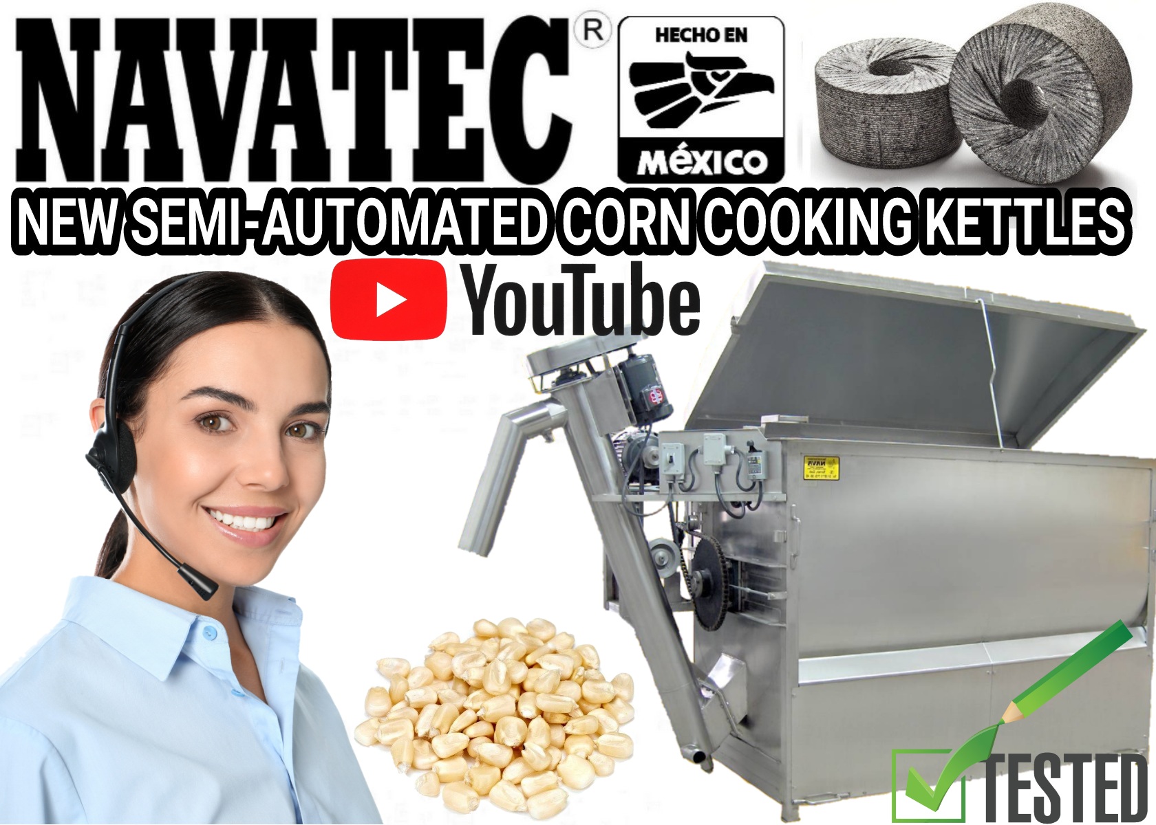 Navatec semi-automatic mechanical corn cooking kettle systems. Cook from 500 to over 2,000 lbs. of corn in a single batch. Kettles are made with 304 stainless steel, includes automatic continuous rotating auger for corn while cooking, avoiding hot pockets for a perfectly cooked batch of Nixtamalized corn