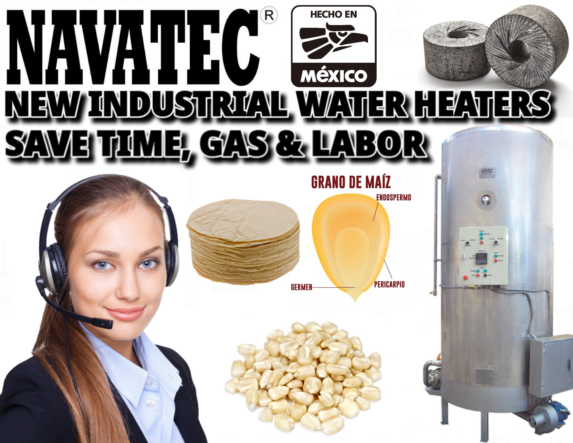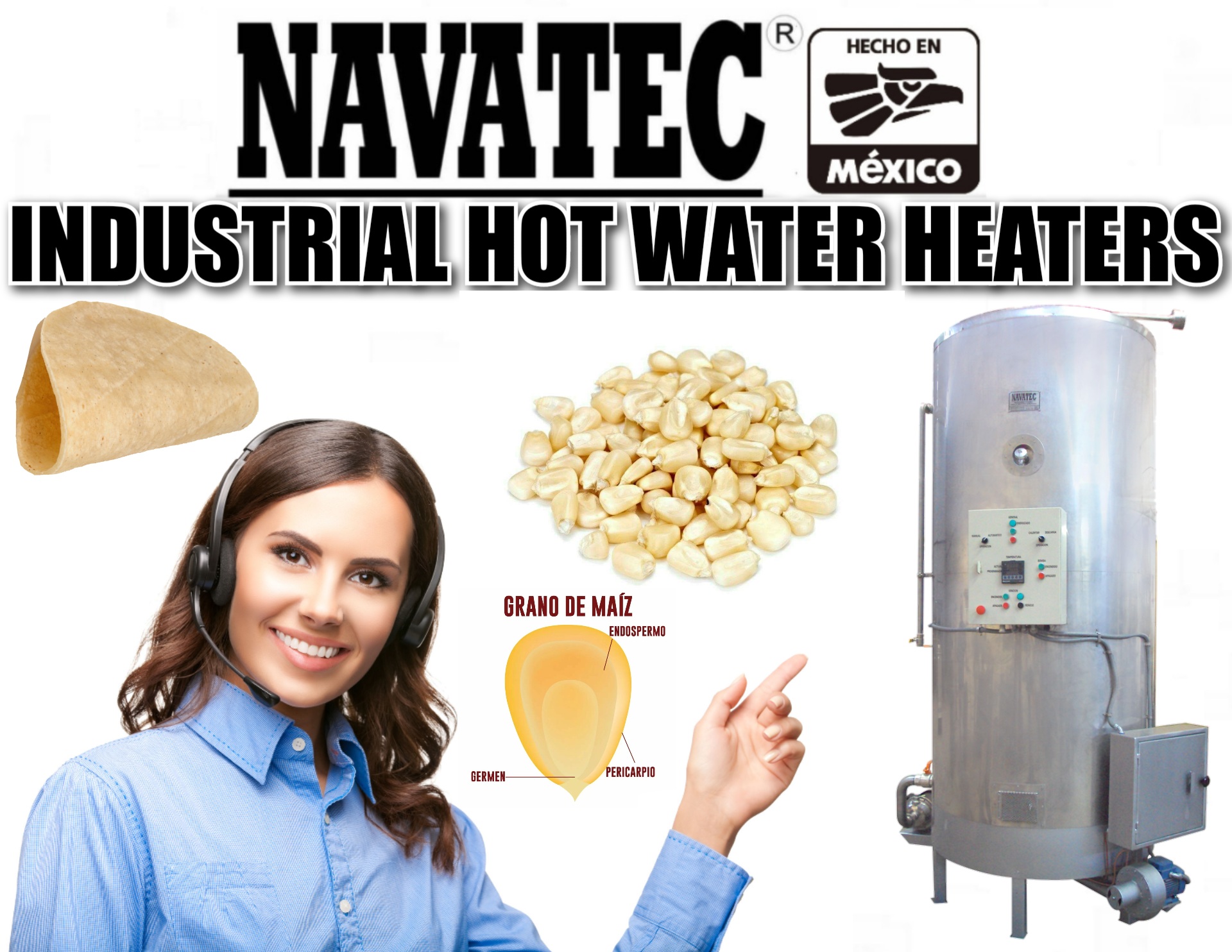 Navatec Industrial hot water heaters made with all stainless steel inside & out. Save gas & labor by continually using 90+ degree water when cooking corn. From 50 Gls. up to cooking 45,000 lbs. of corn in 24 hours