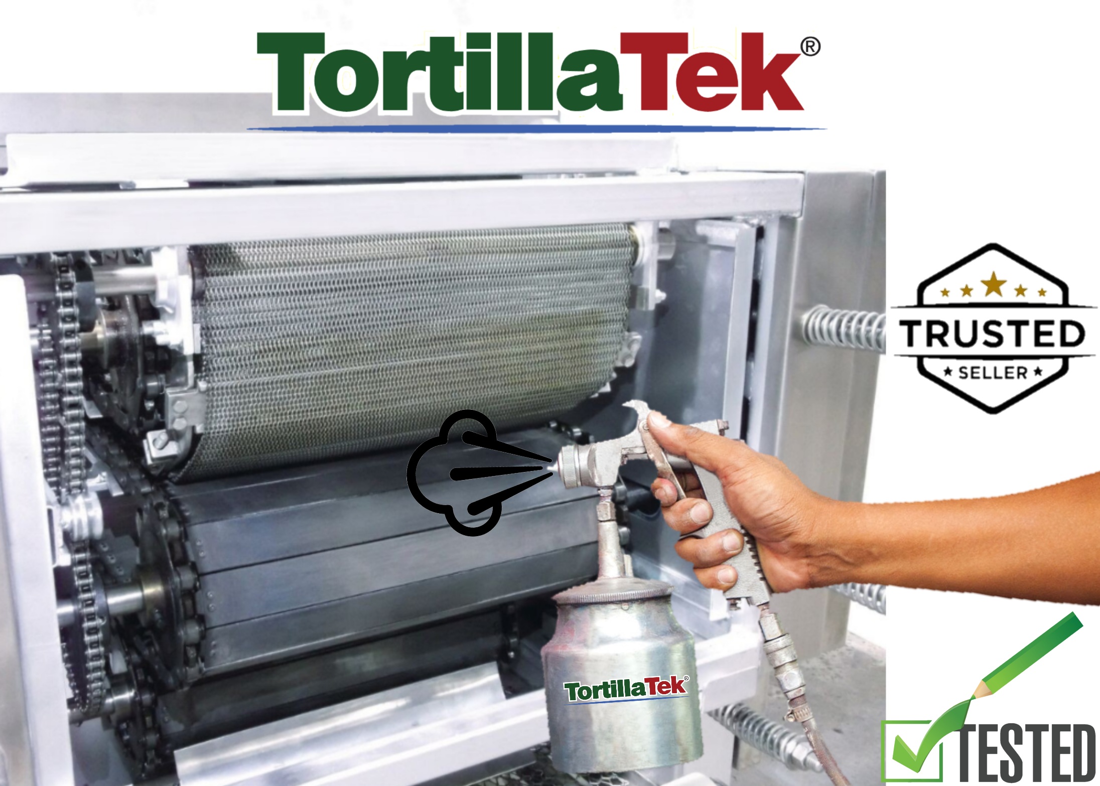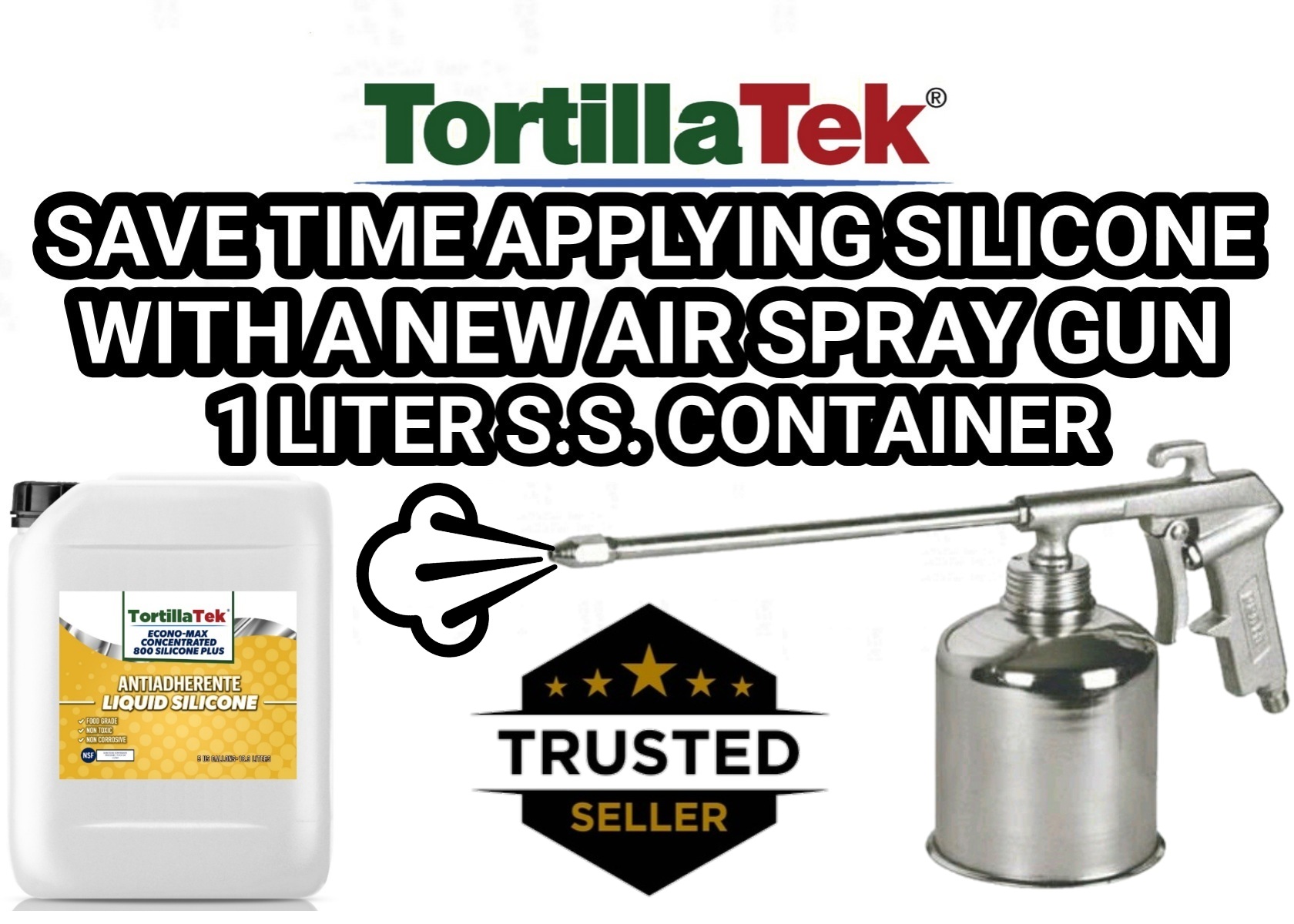 Spraying TortillaTek MAX concentrated & Ready-To-Use (RTU) non-stick liquid silicone on your tortilla oven slatbelts is fast and easy with this aluminum siphon spray gun with a screw-on stainless steel container