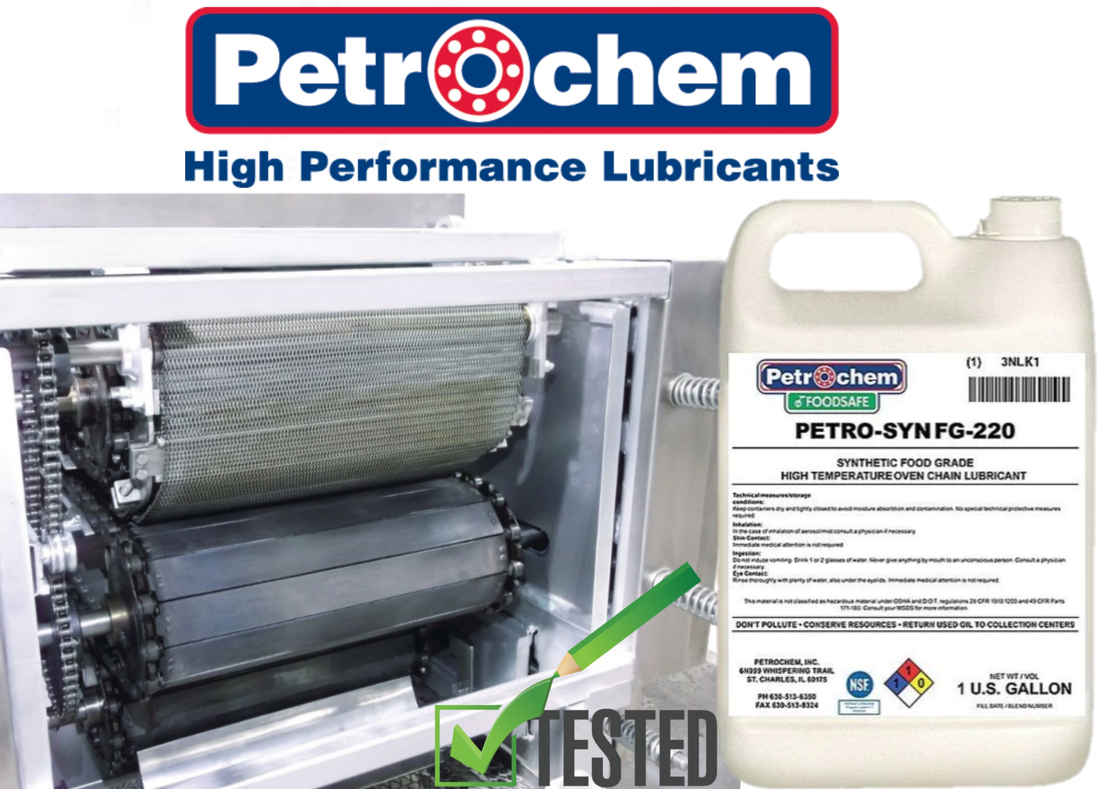 High temperature synthetic food grade oven chain lubricant by Petrochem, PETRO-GARD 220 oven chain lubricant is a food grade, high temperature based synthetic chain oil fortified with anti-wear additives and oxidant inhibitors that optimize the performance and stability of the lubricant. The natural detergency of PETRO-GARD food grade 220 H1 minimizes carbon buildup on chains contributed by conventional food grade PAO’s, mineral, and vegetable-based lubricants when exposed to higher temperature oven environments. It has a high flash point and a recommended operating temperature range of -25º C to 315º C (-13º F-599º F) NSF registered H1 food grade meets all regulations set by the FDA (21CFR 178.3750) approved for incidental contact with food in and around food processing areas