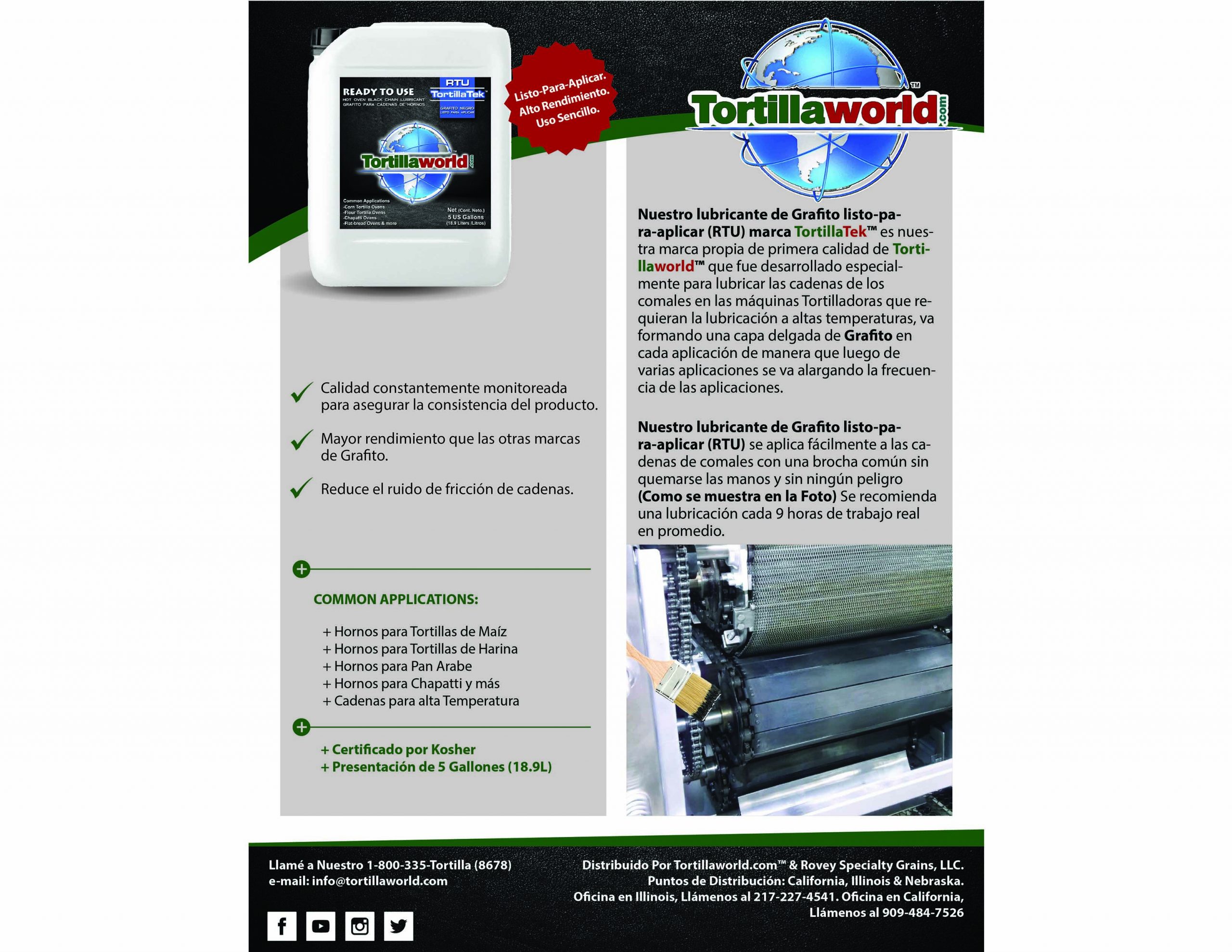 The post TortillaTek Graphite based Ready-To-Use oven chain lubricant for sale. GRAFITO Listo-Para-Usar first appeared on Tortillaworld.com.