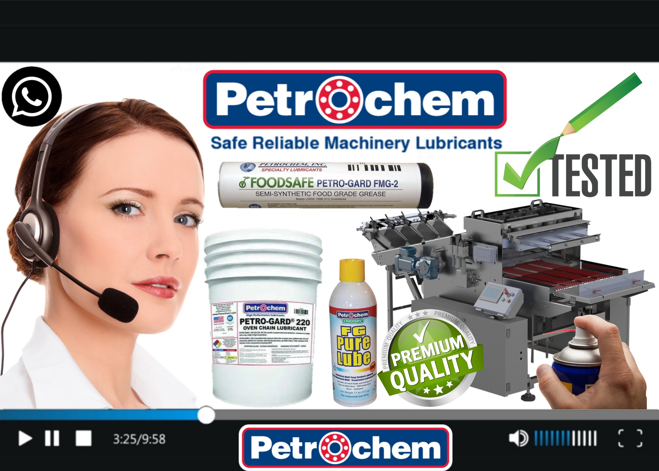 The food industry has not had an affordable, premium, high-temperature and food-grade ALL-IN-ONE product solution; UNTIL NOW! This product is designed for use in food & drug processing plants, on conveyors, chains, bakery ovens, racks, slicers, casters, and more. FG PURE LUBE has a high flash point & a recommended operating temperature range of -25°C to 315°C (-13°F to 599°F) NSF registered H1 food grade acceptable for incidental contact with food in and around food processing areas. FG PURE LUBE spray lubricant sold by the case containing 12-11 oz. cans (311.84 g.)