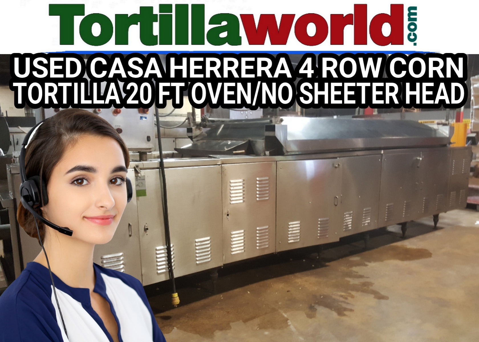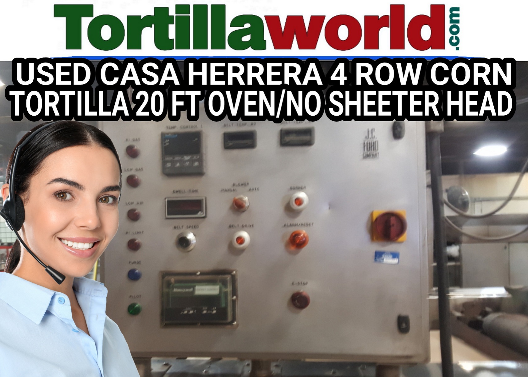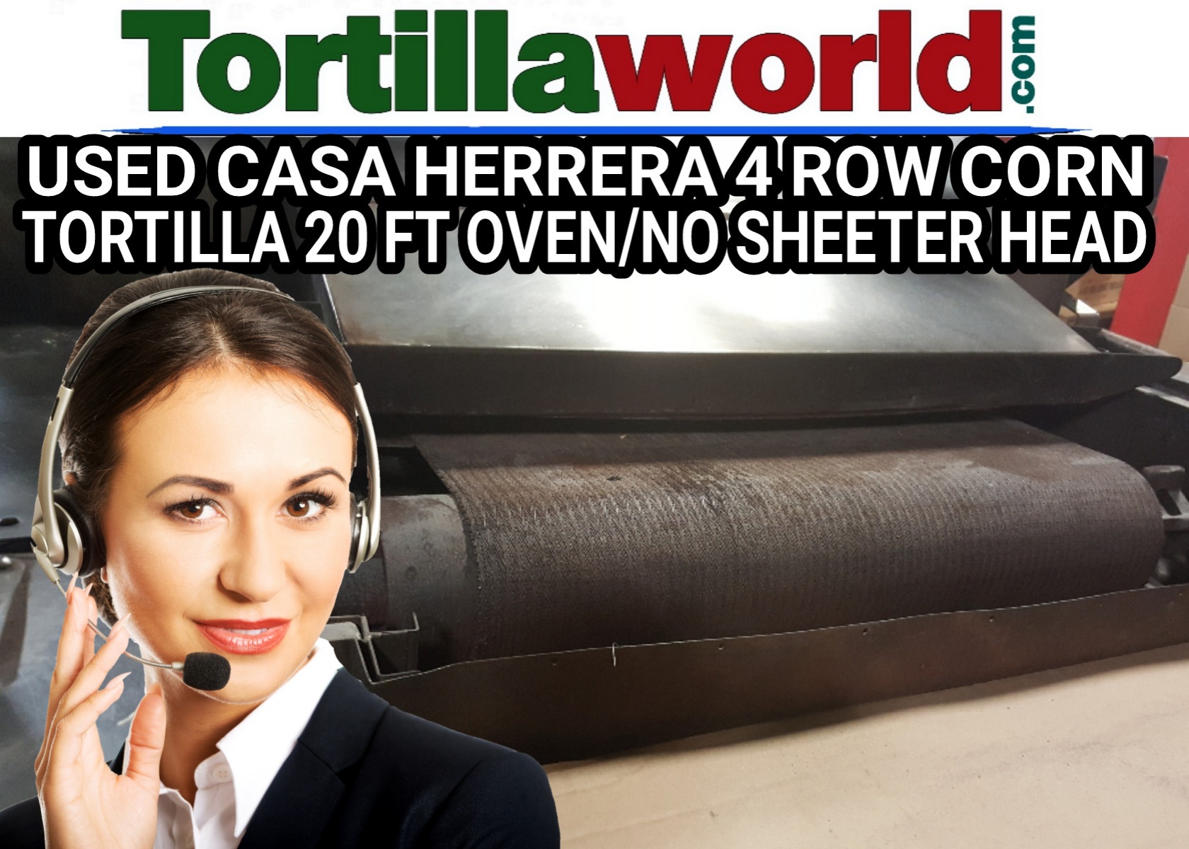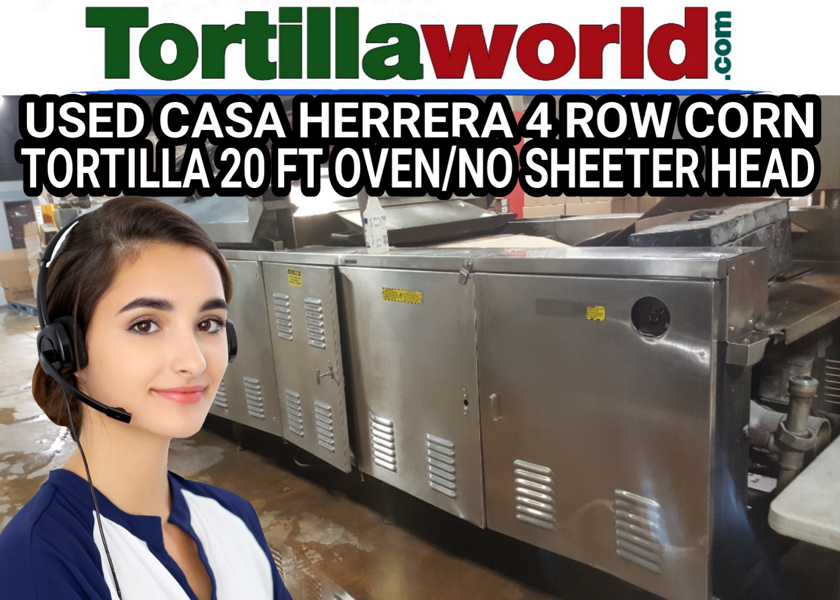 Used Casa Herrera 4 row corn tortilla 20 ft. oven with all CB-5 belting for making corn tortilla chips, refurbished by JC Ford a few years ago. Plenty of room for a sheeter head. No Sheeter head included.