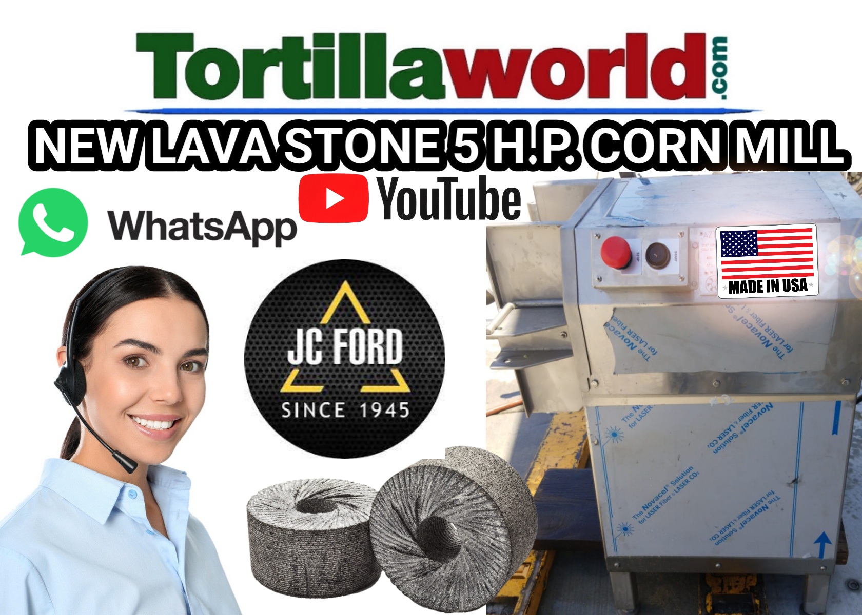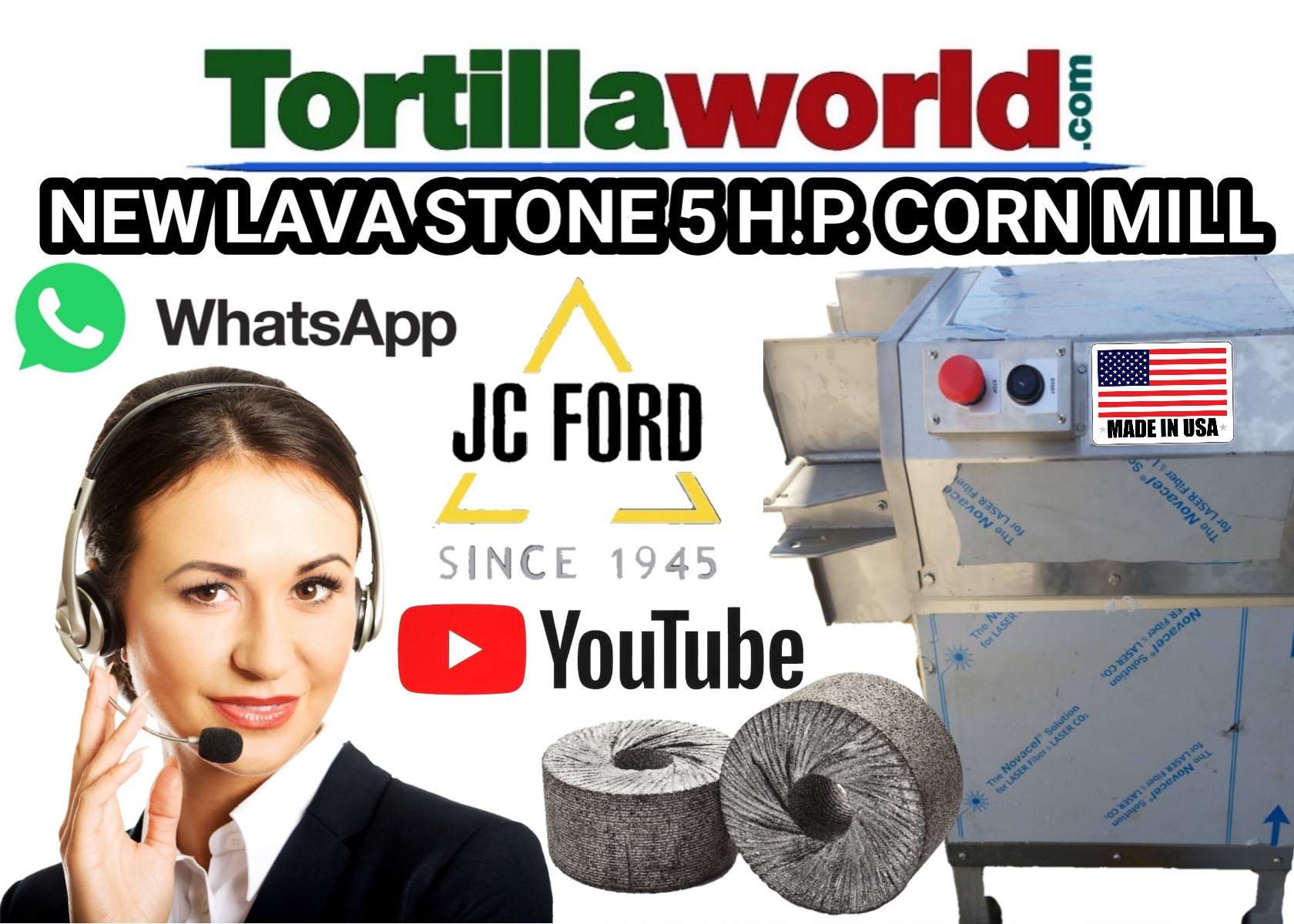 New JC Ford 5 HP lava stone corn mill with corn hopper, magnetic starter and 2 new sets of lava stones