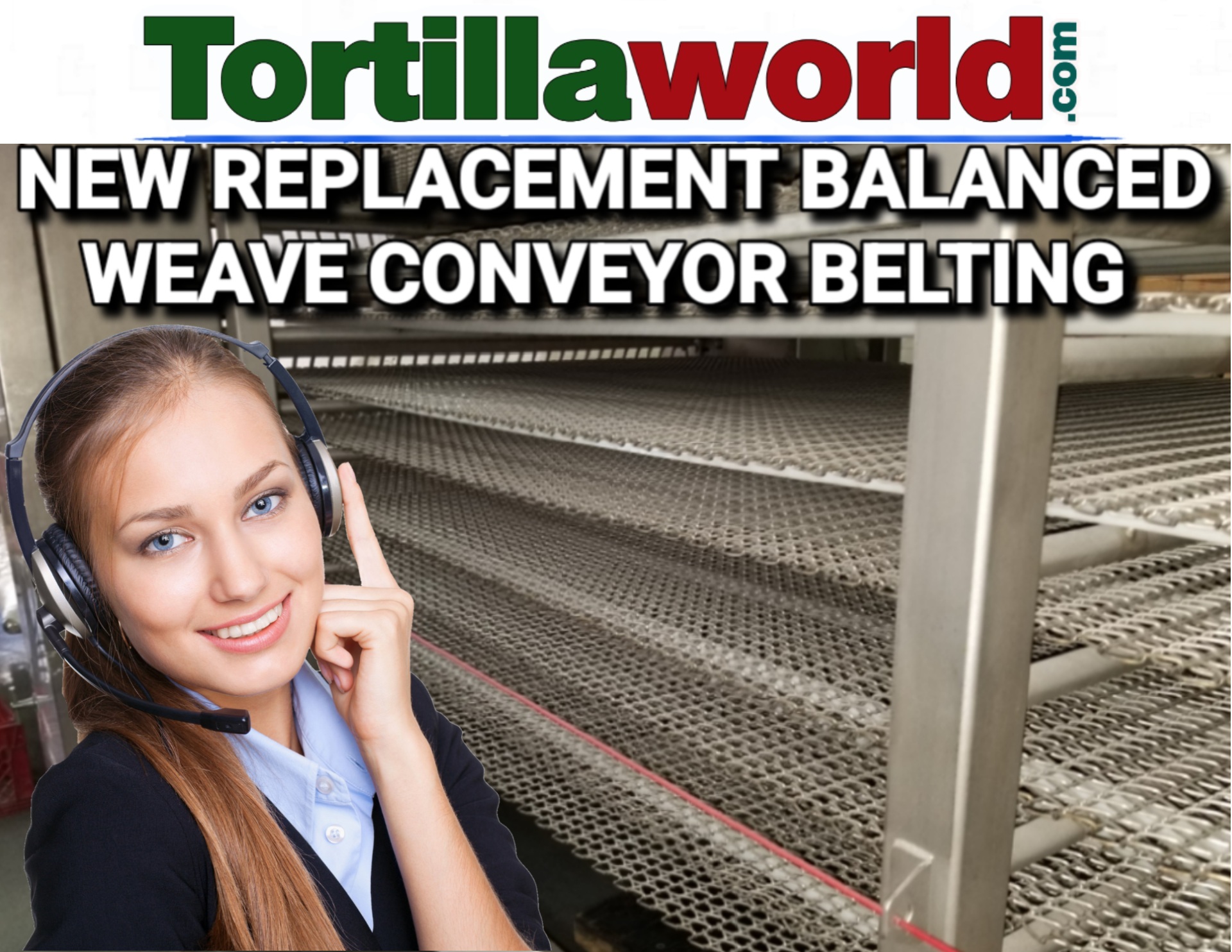 Replacement stainless steel balance weave style belting for corn & flour tortilla cooling conveyors sold by the foot in all sizes for corn & flour tortilla cooling conveyors. Total length in feet & inches? width of belting? brand of conveyor? how many tiers does the conveyor have? year conveyor was made? which tier are you replacing, 1st, 2nd or 3rd etc? send pictures of belting. Send us your contact information & information below where it says submit a comment