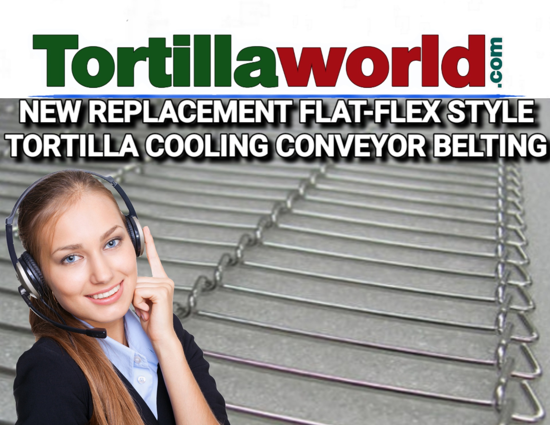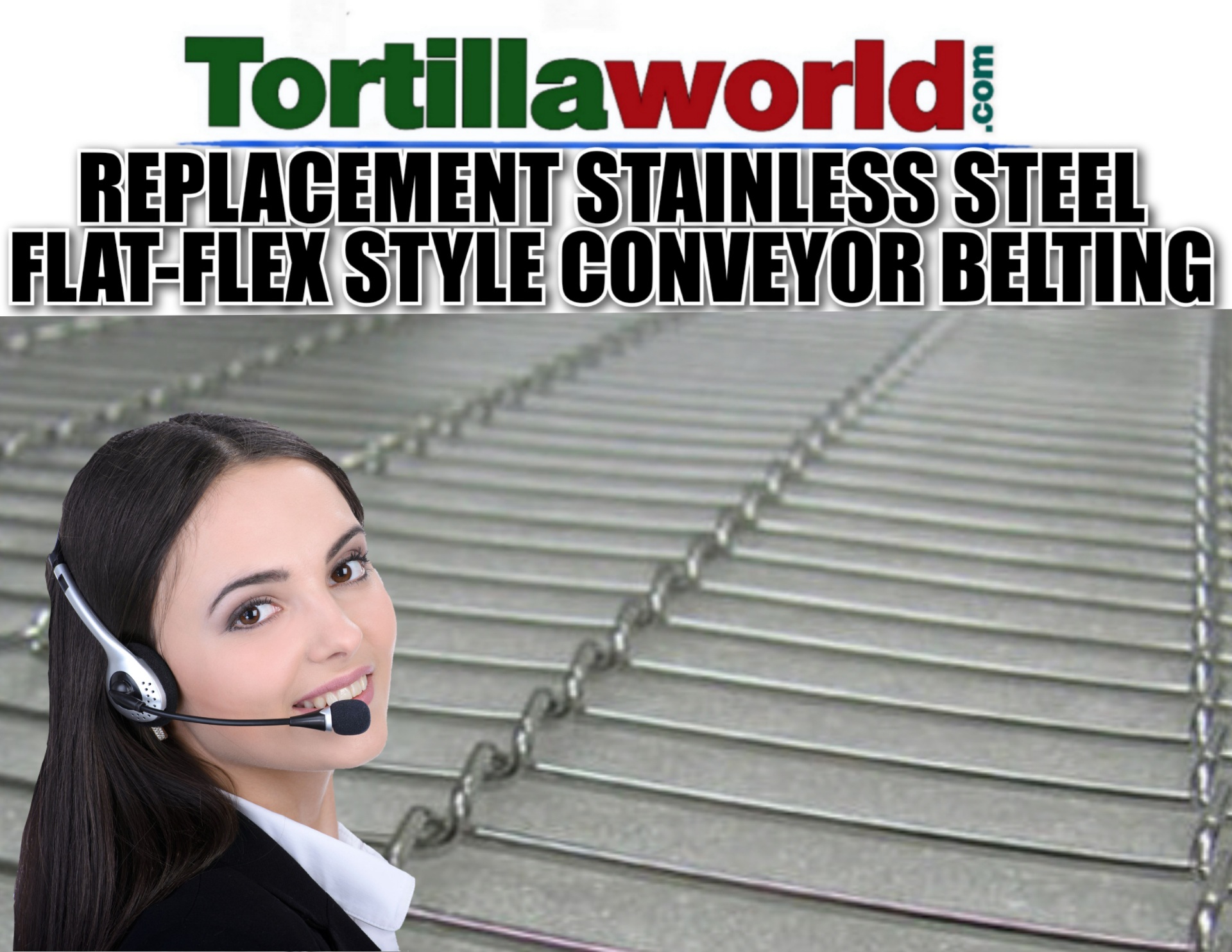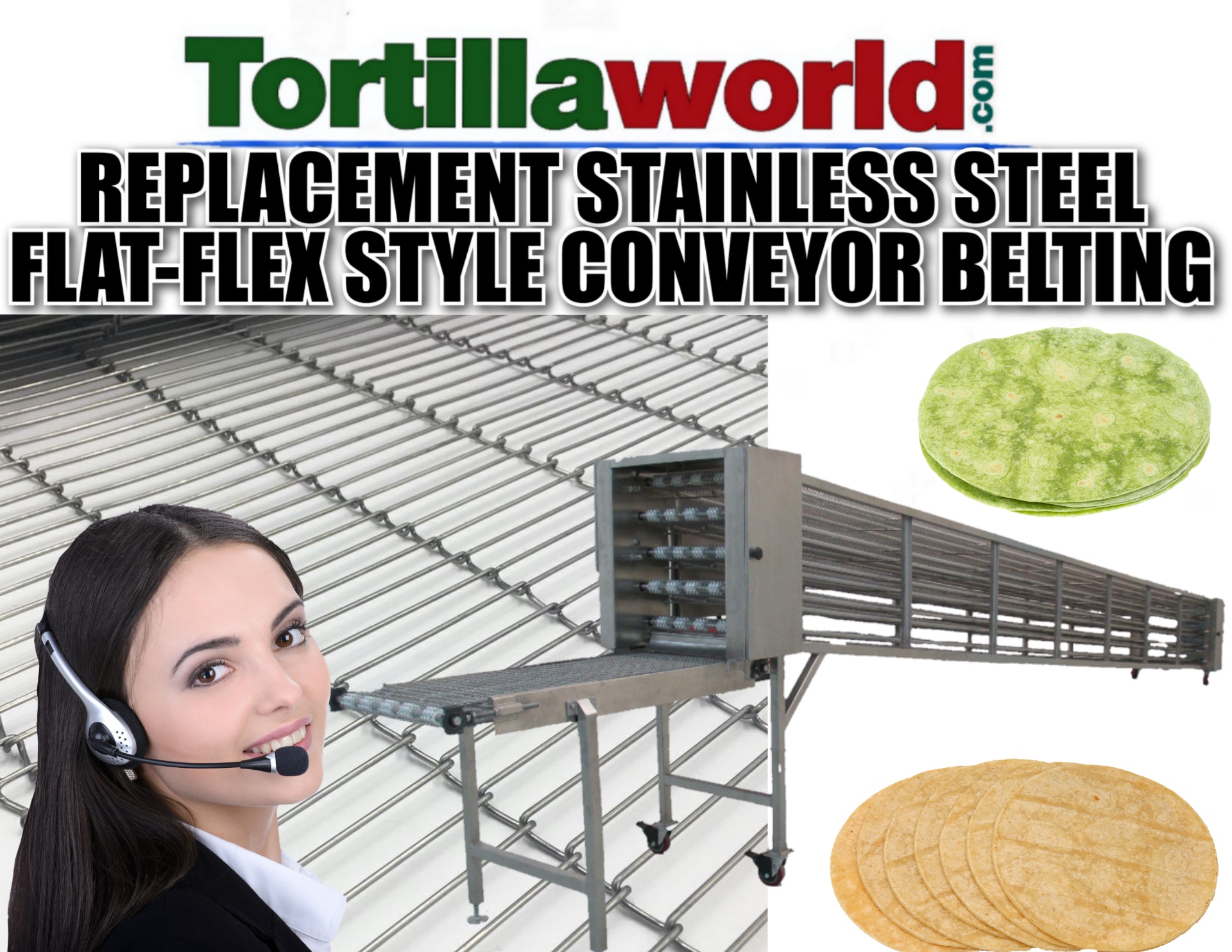 Replacement stainless steel Flat-Flex style belting tortilla cooling conveyors. This belting is sold by the foot in all sizes for corn & flour tortilla cooling conveyors. Tell us total length in feet & inches? width of belting? brand of conveyor? how many tiers does the conveyor have? year conveyor was made? which tier are you replacing, 1st, 2nd & 3rd? send photos of belting. Write your contact & general information above of your belting below where it says submit a comment