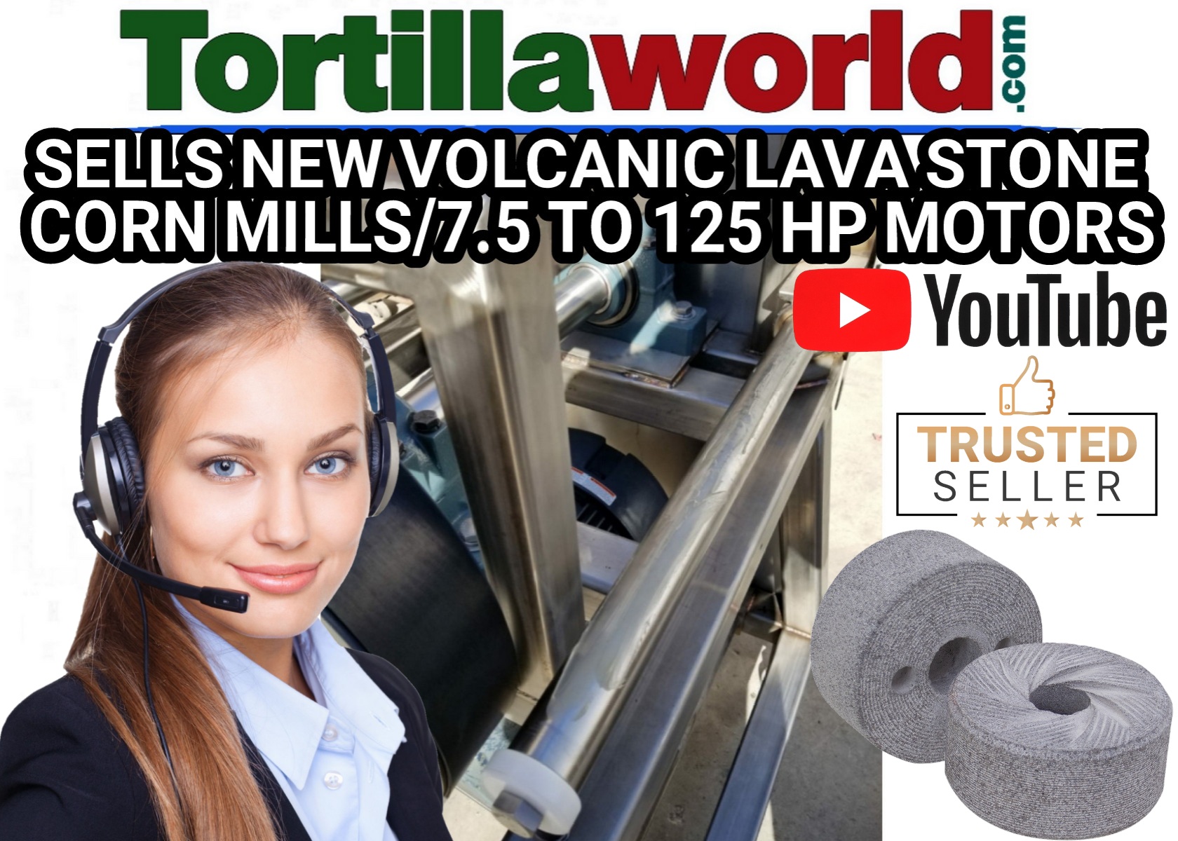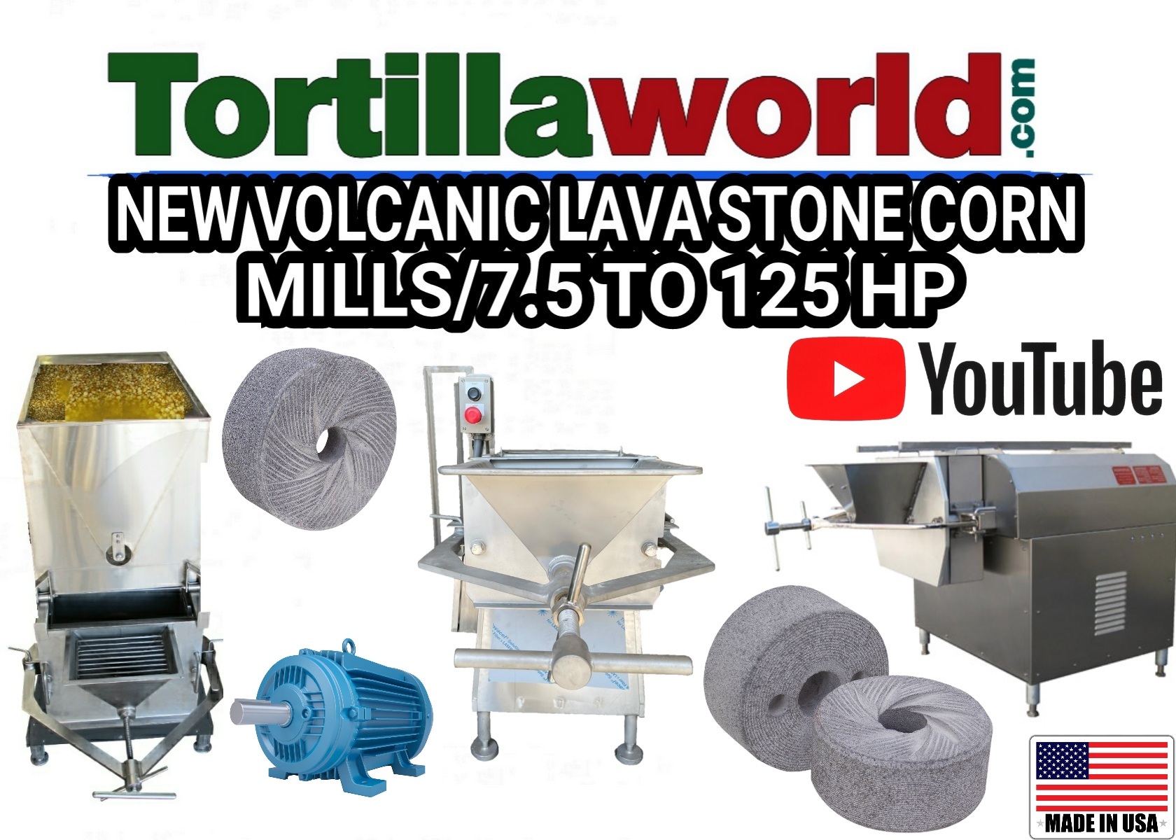 New custom made stainless steel lava stone corn mills from 5 to 125 H.P. Options available: Heavy duty bearings, Heavy duty motor, corn hopper with speed reducer and magnetic starters