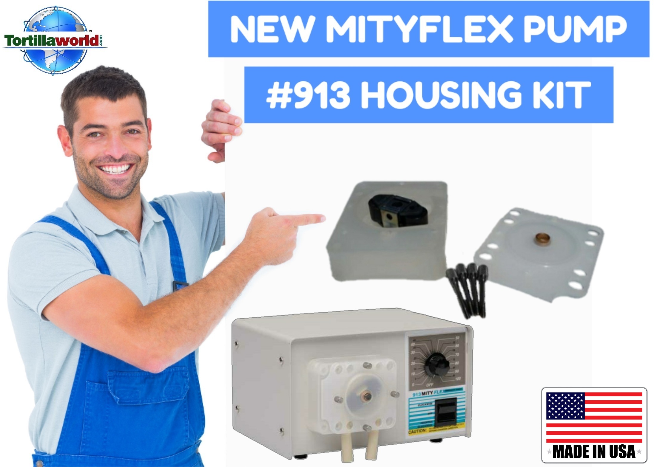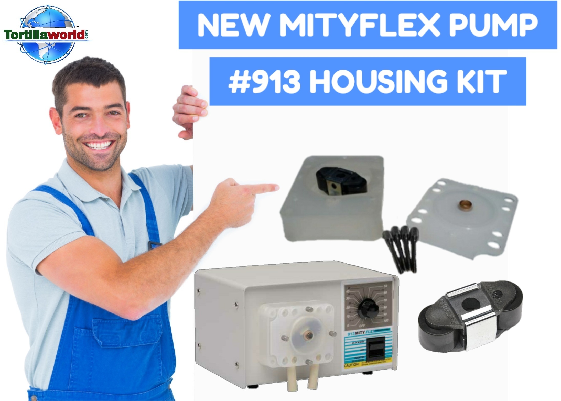Original factory replacement parts kit includes housing cover, thumb screws, and roller bracket assembly.for the MityFlex # 913 chemical pump commonly used in the tortilla industry for dispensing liquid corn tortilla preservatives. Don’t replace the entire pump when all you need is the housing & roller bracket assembly. We have a few left
