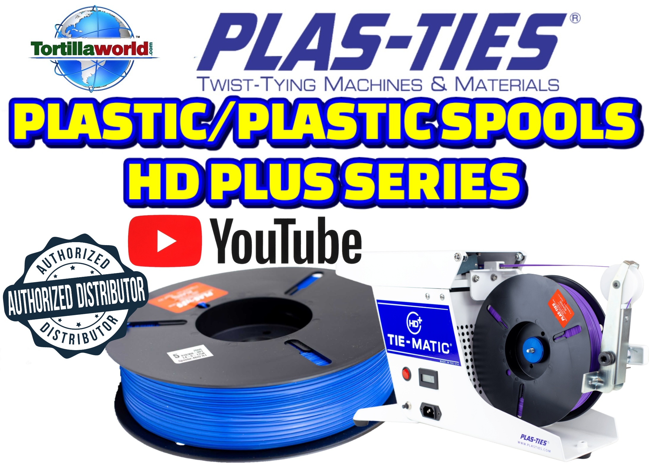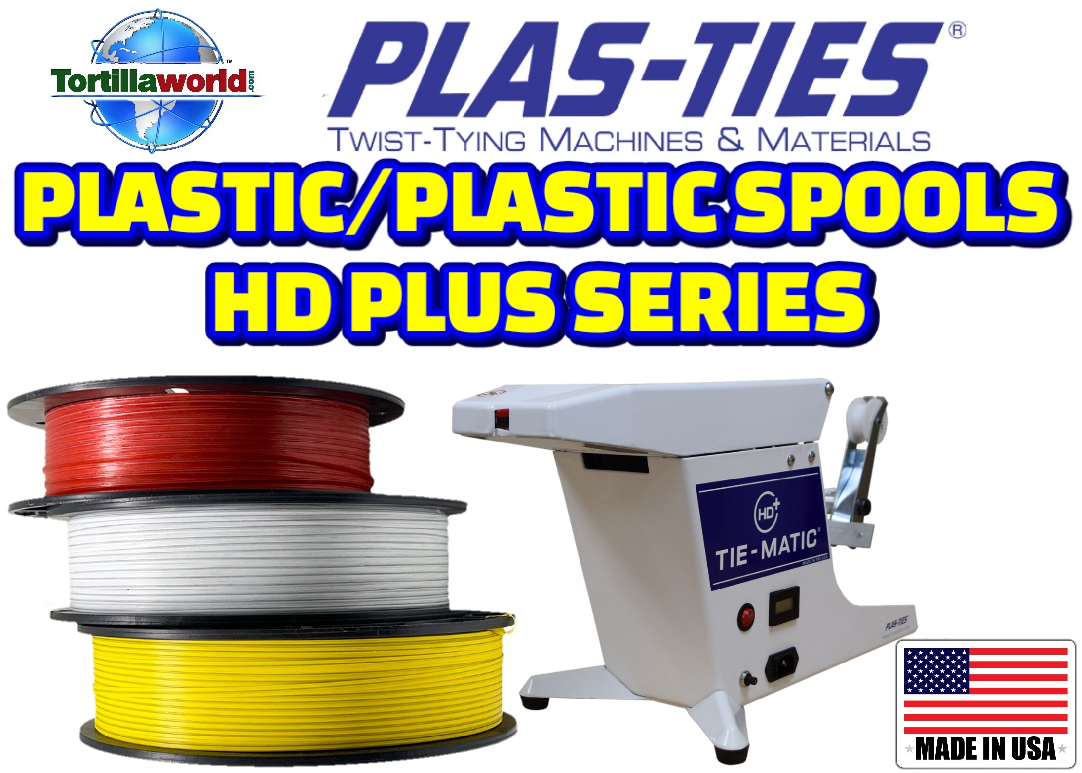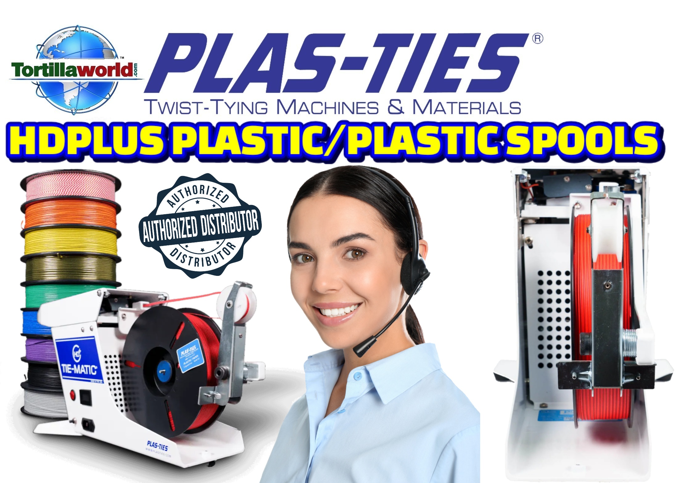 Tortillaworld is an authorized distributor of Plas-Ties who sells the complete line of HD-series twist-tying machines, materials, accessories & parts. Genuine Plas-Ties twist-tie material provides maximum performance from your Tie-Matic HD-series twist-tying machines. The durable, flexible, and reusable plastic material provides superior temporary fastening solutions for all your applications. The #311 spools are designed with a metal core encased in plastic to resist rust. The flexible core and plastic sheath wrap around an object to be bundled. From the food industry to the Industrial marketplace, our spools provide the ideal closure for your products. Choose from a multitude of colors including: Red, White, Blue, Green, Yellow, Orange, Black, Brown, Tan, Grey, Pink, Violet & Clear. The #311 spool is ideal for usage on the Tie-Matic HD-series machines. Depending on the machine used, the 2000 foot spool length supplies 4,800-6,400 ties per spool
