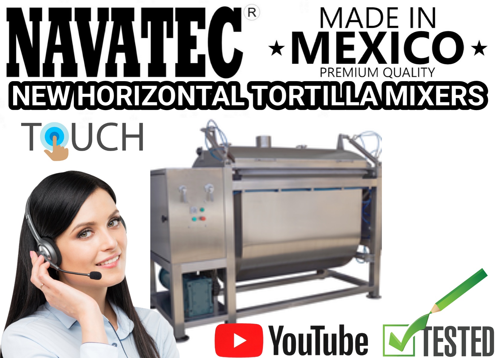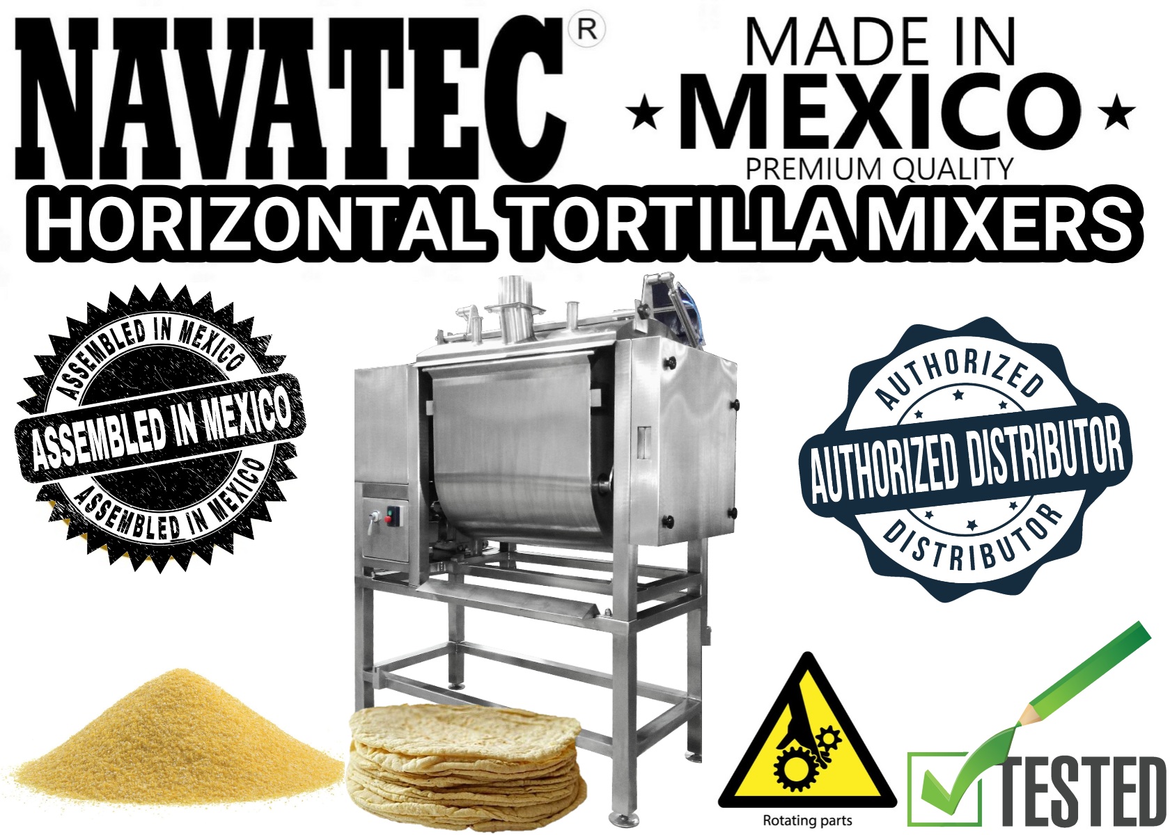 Navatec heavy duty horizontal tortilla mixers made with 304 stainless steel, name brand electrical components, built in timer, jog & up & down control switches
