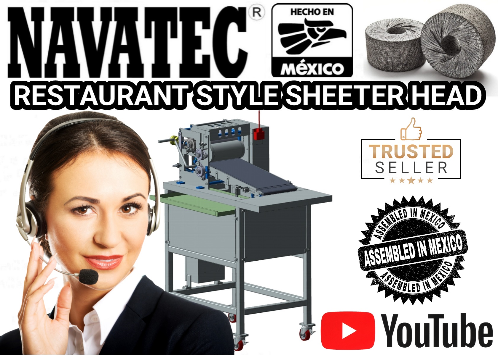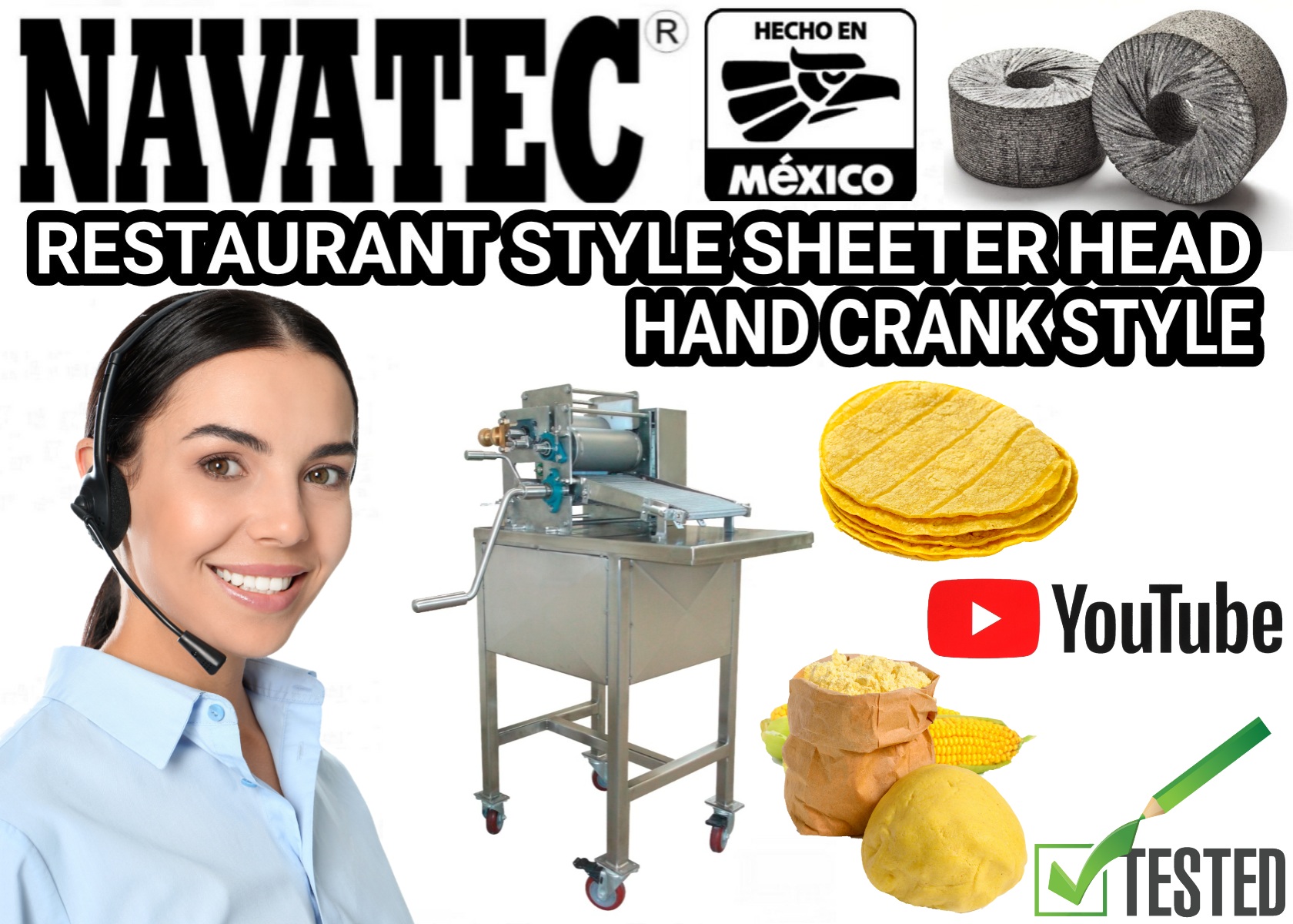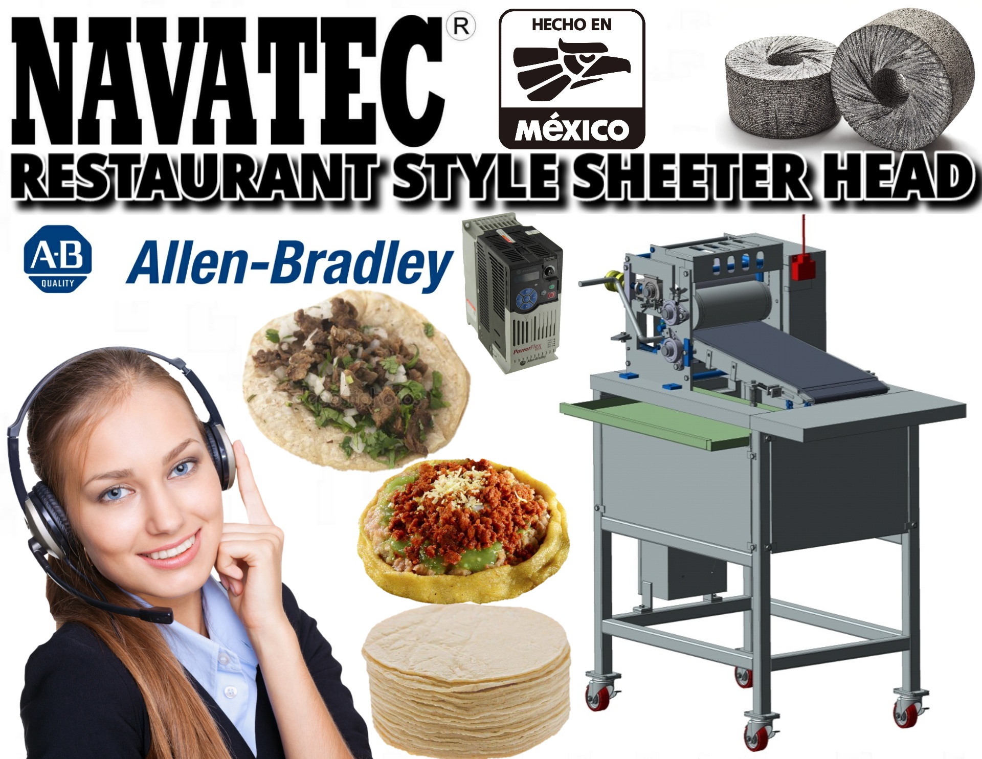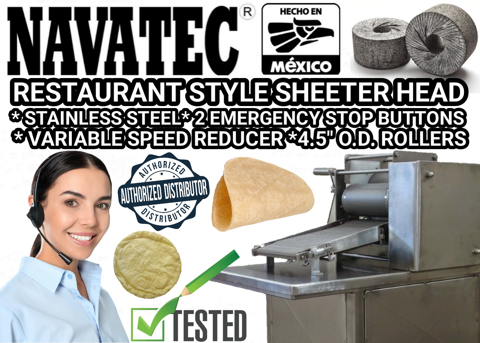 Navatec restaurant style sheeter head makes up to 20 corn tortillas per minute. Made heavy duty with 304 stainless steel, Allen Bradley electrical components, 4½” rollers, variable speed reducer, ½ HP. motor, 2 emergency stops and 1 die cutter
