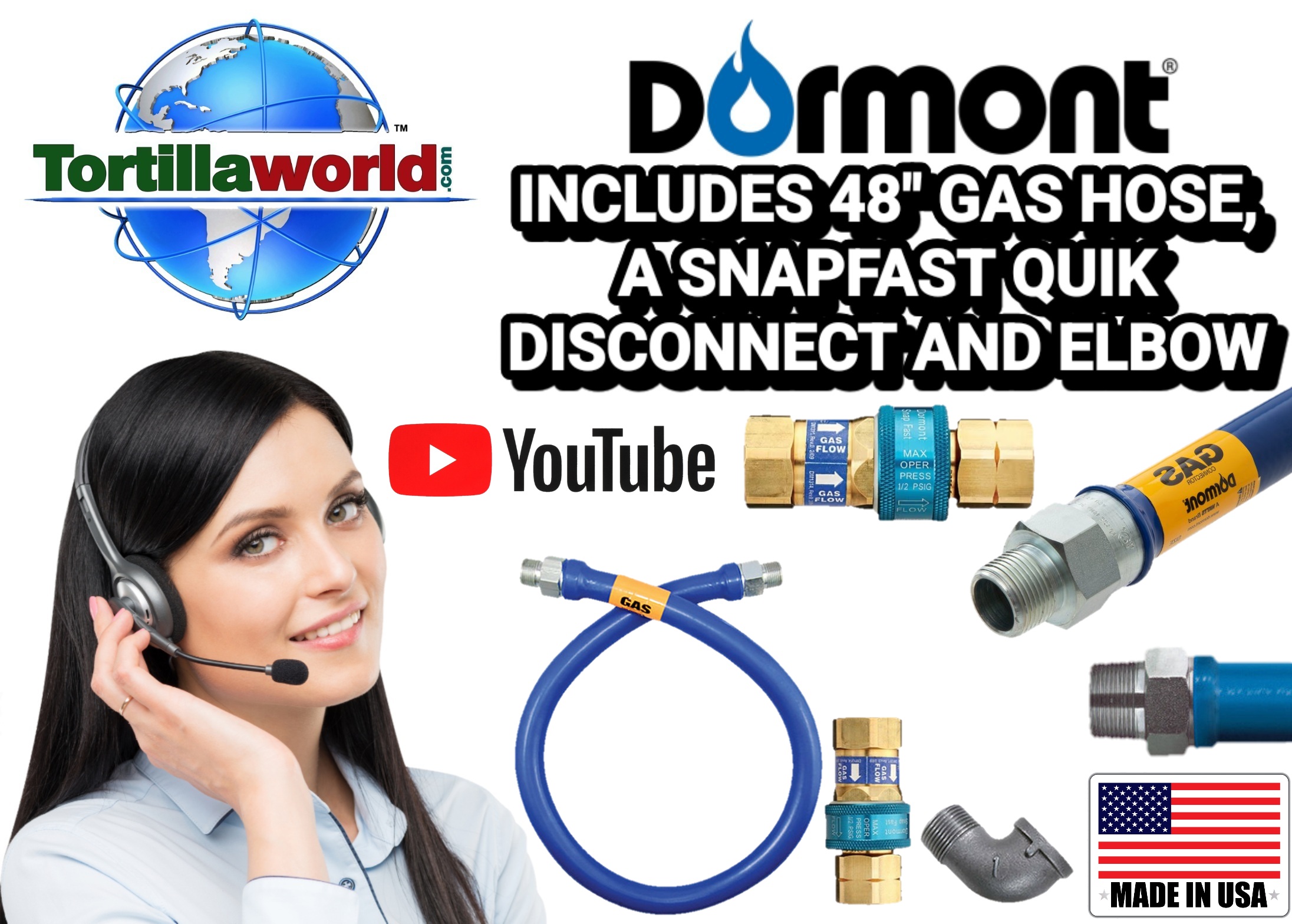 Commercial grade gas hose kit #16100BPQ48 contains, (1) 1-48″ long commercial grade movable gas hose connector composed of 301 stainless steel corrugated tube covered with a tight weave of stainless steel braid specifically engineered for caster mounted commercial cooking & tortilla Industry equipment like traditional corn cooking tubs, tortilla chips, tostadas and churrito basket fryers from 30 per hour etc. The outside hose coating is an antimicrobial PVC coating that inhibits growth of bacteria, mold and mildew on the connector. Rotational technology fittings on both ends of the connector rotate 360 degrees, greatly reducing stress at both connector ends. (2) 1-1″ Snapfast quik disconnect gas hose safety coupling is a durable push to connect & disconnect coupling that contains a thermal shutoff feature which is a polymer ring located inside the nipple that will melt and close the gas supply valve if the temperature rises above 350° F (177° C). The Snapfast quick disconnect couplings are designed to work only with the brand name of gas hose that we sell. It also features a push to connect feature which allows the coupling’s components to be joined quickly by simply pushing them together until they snap into place. The Snapfast disconnects the gas flow for safe, easy cleaning & maintenance and reconnects with just a push and a click. (3) 1-1″ elbow.