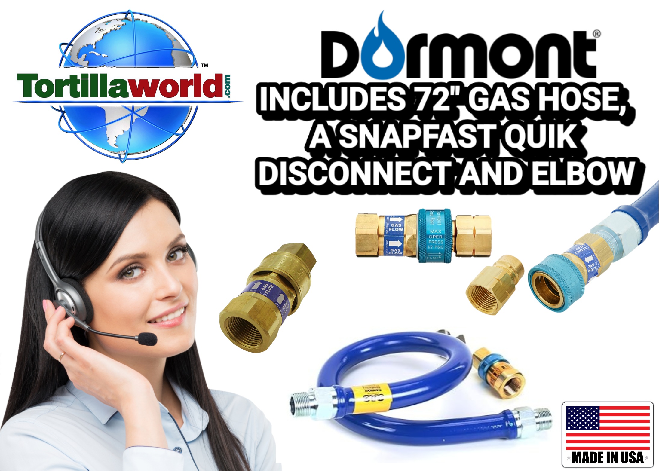 Commercial grade gas hose kit # 16100BPQ72 contains, (1) 1-72″ long commercial grade movable gas hose connector composed of 301 stainless steel corrugated tube covered with a tight weave of stainless steel braid specifically engineered for caster mounted commercial cooking & tortilla Industry equipment like traditional corn cooking tubs, tortilla chips, tostadas and churrito basket fryers from 30 per hour etc. The outside hose coating is an antimicrobial PVC coating that inhibits growth of bacteria, mold and mildew on the connector. Rotational technology fittings on both ends of the connector rotate 360 degrees, greatly reducing stress at both connector ends. (2) 1-1″ Snapfast quik disconnect gas hose safety coupling is a durable push to connect & disconnect coupling that contains a thermal shutoff feature which is a polymer ring located inside the nipple that will melt and close the gas supply valve if the temperature rises above 350° F (177° C). The Snapfast quick disconnect couplings are designed to work only with the brand name of gas hose that we sell. It also features a push to connect feature which allows the coupling’s components to be joined quickly by simply pushing them together until they snap into place. The Snapfast disconnects the gas flow for safe, easy cleaning & maintenance and reconnects with just a push and a click. (3) 1-1″ elbow.