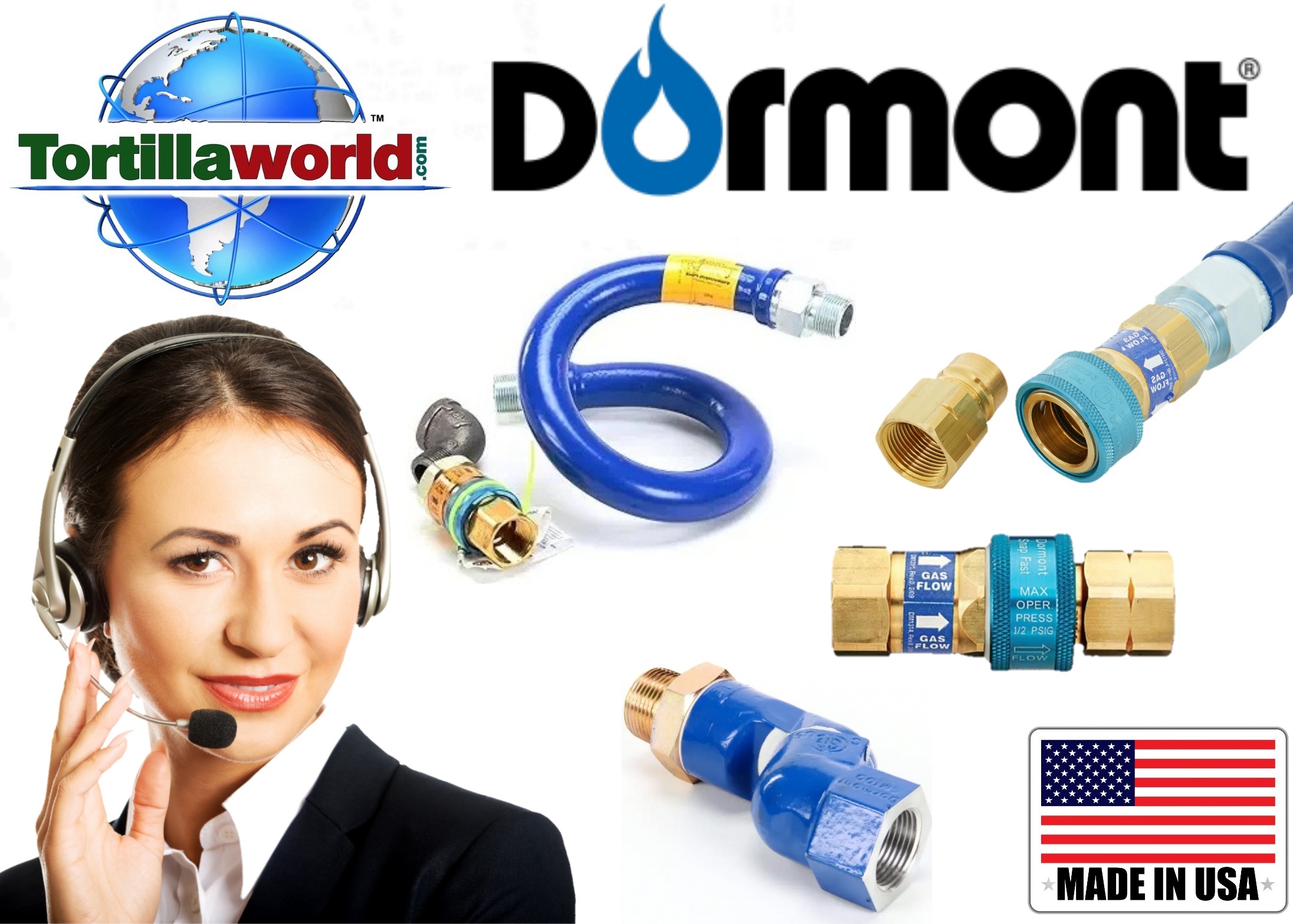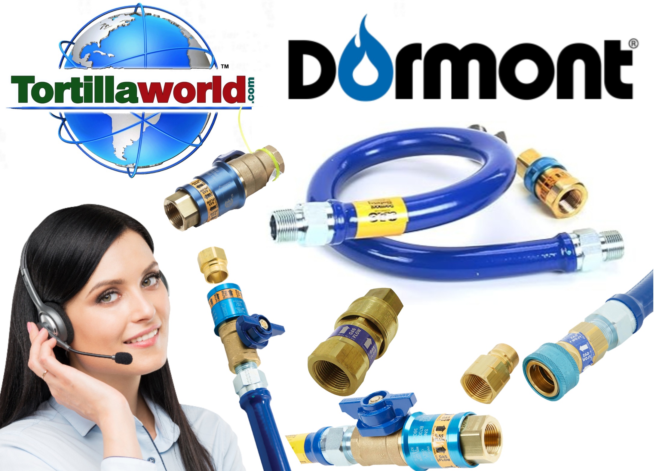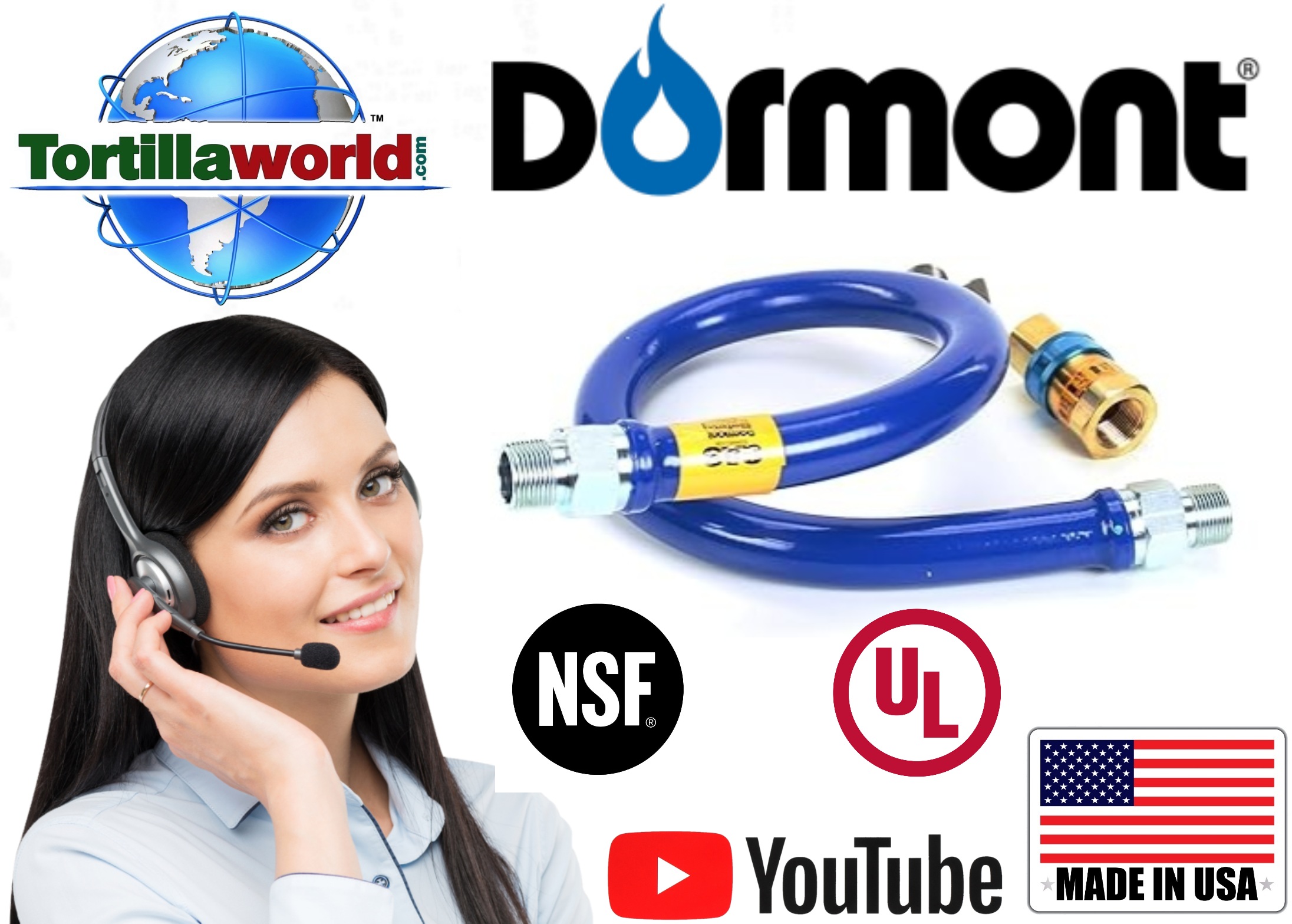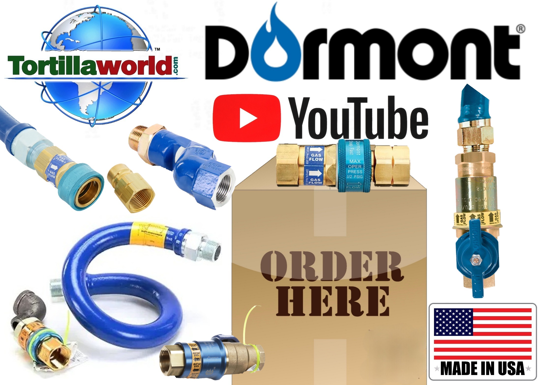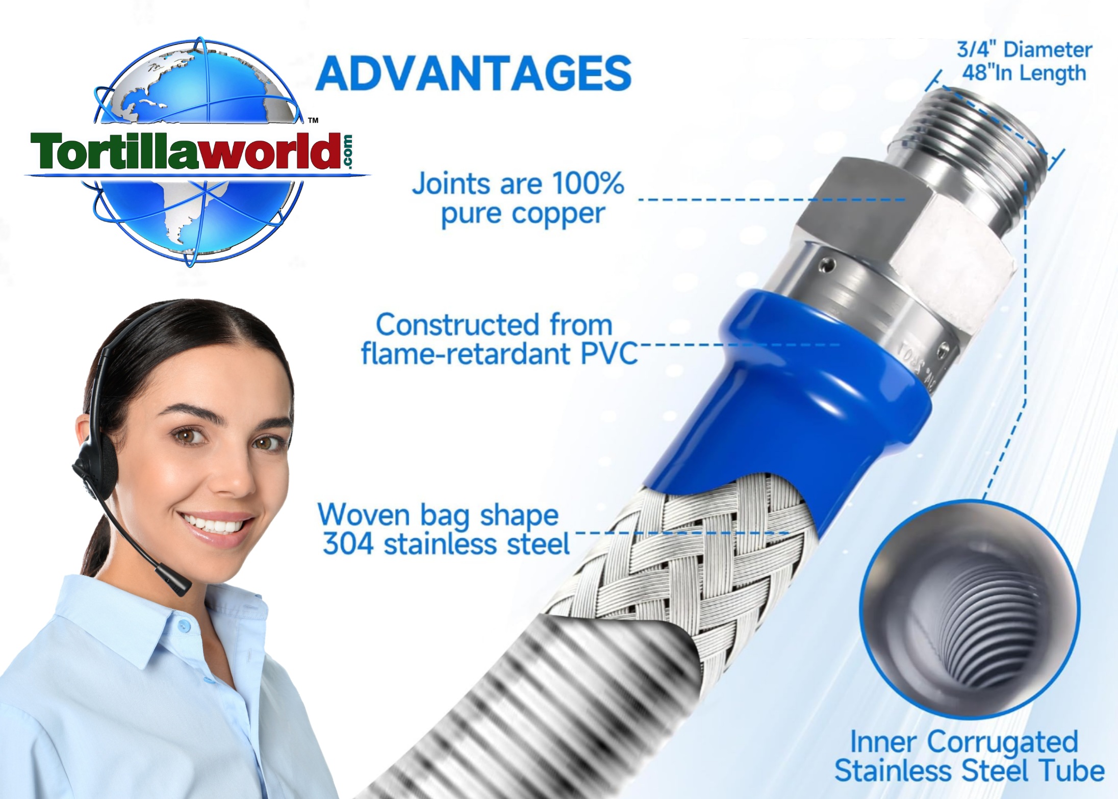Commercial grade gas hose kit #16100BPCF48 contains, (1) 1-48″ long commercial grade movable gas hose connector composed of 301 stainless steel corrugated tube covered with a tight weave of stainless-steel braid specifically engineered for caster mounted commercial cooking & tortilla Industry equipment like traditional corn cooking tubs, tortilla chips, tostadas and churrito basket fryers from 30 per hour etc. The outside hose coating is an antimicrobial PVC coating that inhibits growth of bacteria, mold and mildew on the connector. Rotational technology fittings on both ends of the connector rotate 360 degrees, greatly reducing stress at both connector ends. (2) 1-1″ Safety quik disconnect valve is designed specifically for the food industry, meeting the safety and operational needs of commercial kitchens, doing the work of both a quick disconnect and a valve. The gas connector cannot be disconnected until the gas valve is shut off and cannot be opened until the gas connector is attached and employs a number of safety measurements while acting as a convenient quick disconnect fitting. The valve also has an internal thermal shutoff feature to protect against dangerous temperatures near the gas supply. (3) 1-1″ elbow