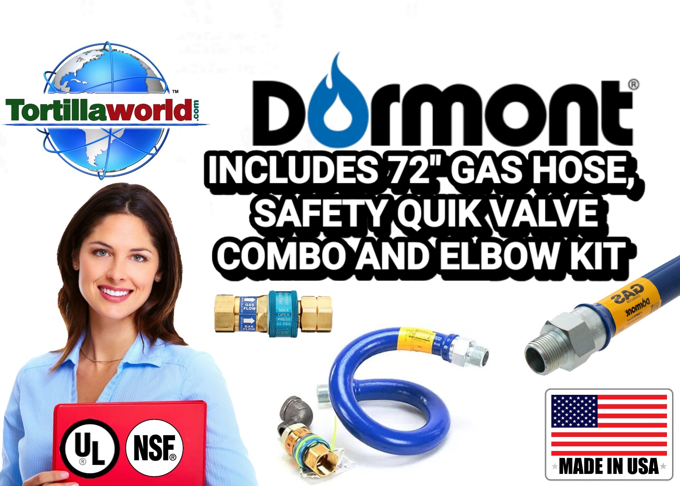 Commercial grade gas hose kit #16100BPCF72 contains (1) 1-72″ long commercial grade movable gas hose connector composed of 301 stainless steel corrugated tube covered with a tight weave of stainless steel braid specifically engineered for caster mounted commercial cooking & tortilla Industry equipment like traditional corn cooking tubs, tortilla chips, tostadas and churrito basket fryers from 30 per hour etc. The outside hose coating is an antimicrobial PVC coating that inhibits growth of bacteria, mold and mildew on the connector. Rotational technology fittings on both ends of the connector rotate 360 degrees, greatly reducing stress at both connector ends. (2) 1-1″ Safety quik disconnect valves designed specifically for the food industry, meeting the safety and operational needs of commercial kitchens, doing the work of both a quick disconnect and a valve. The gas connector cannot be disconnected until the gas valve is shut off and cannot be opened until the gas connector is attached and employs a number of safety measurements while acting as a convenient quick disconnect fitting. The valve also has an internal thermal shutoff feature to protect against dangerous temperatures near the gas supply. (3) 1-1″ elbow