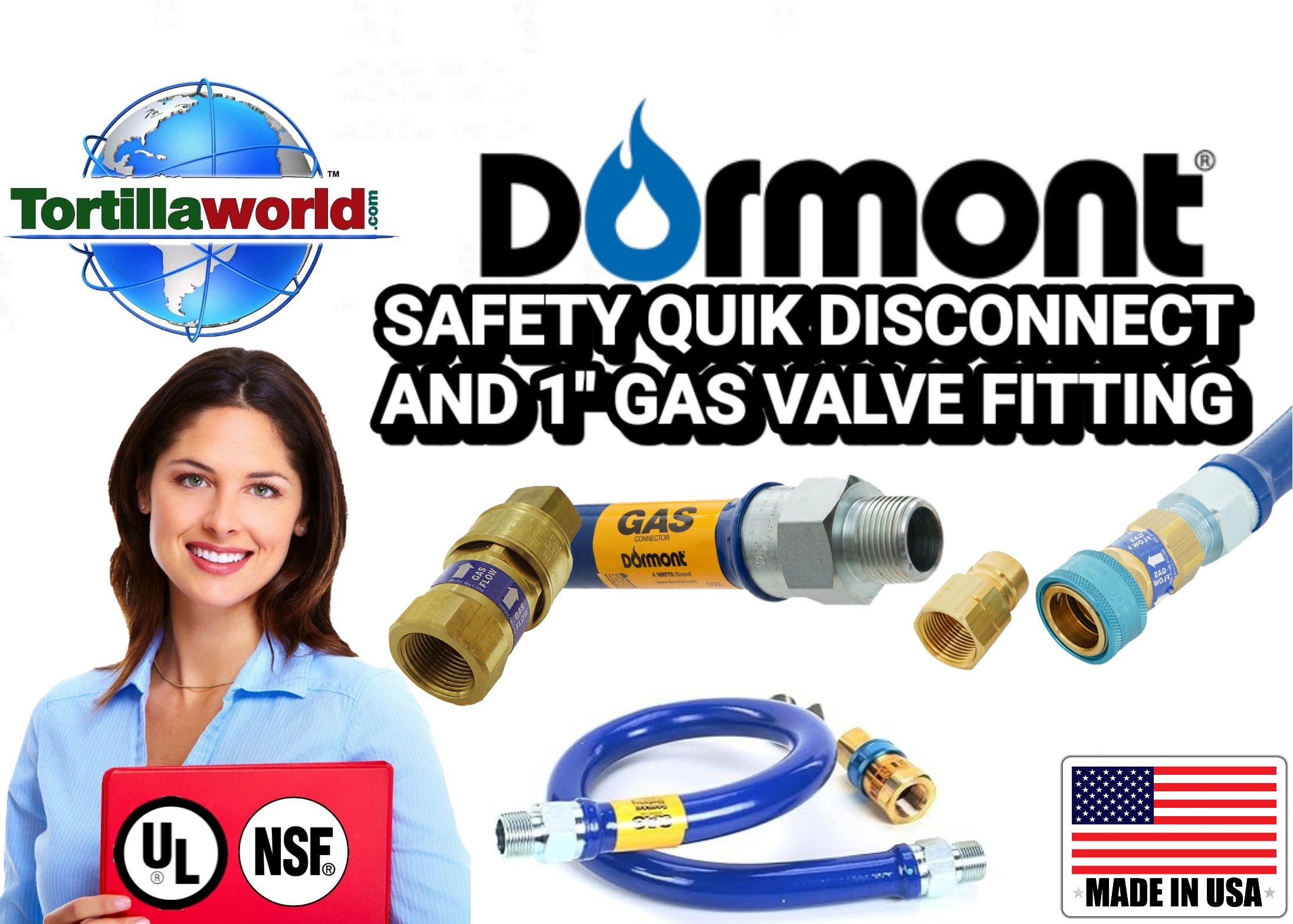 Commercial grade gas hose kit #16100BPCFS36 contains (1) 1-36″ long commercial grade movable gas hose connector composed of 301 stainless steel corrugated tube covered with a tight weave of stainless-steel braid specifically engineered for caster mounted commercial cooking & tortilla Industry equipment like traditional corn cooking tubs, tortilla chips, tostadas and churrito basket fryers from 30 lbs. per hour etc. The outside hose coating is an antimicrobial PVC coating that inhibits growth of bacteria, mold and mildew on the connector. Rotational technology fittings on both ends of the connector rotate 360 degrees, greatly reducing stress at both connector ends. (2) 1-1″ Safety disconnect valve is designed specifically for the food industry, meeting the safety and operational needs of commercial kitchens, doing the work of both a quick disconnect and a valve. The gas connector cannot be disconnected until the gas valve is shut off and cannot be opened until the gas connector is attached and employs a number of safety measurements while acting as a convenient quick disconnect fitting. The valve also has an internal thermal shutoff feature to protect against dangerous temperatures near the gas supply. (3) 1-1″ Swivel Max rotational end fitting for used with gas connectors for commercial kitchen applications. The swivel allows increased movement at either end of the gas connector by providing 360 degrees of multi-plane range of motion. The extra range of motion greatly reduces the stress on the ends of the gas connector. (4) 1-1″ elbow