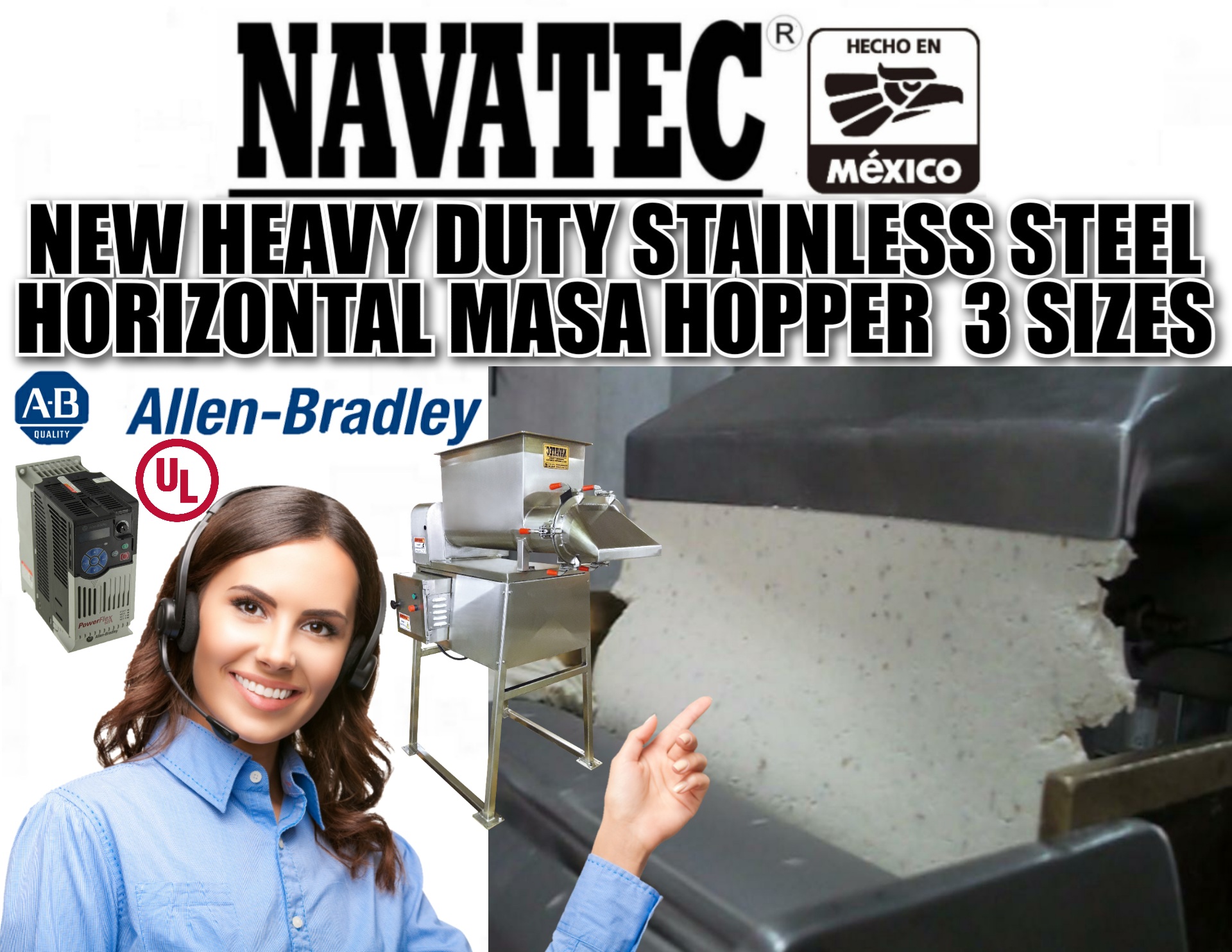 Navatec Heavy duty horizontal masa hopper made with 304 stainless steel, single & double auger, name brand electronics, variable speed drive available in three masa hopper capacity sizes