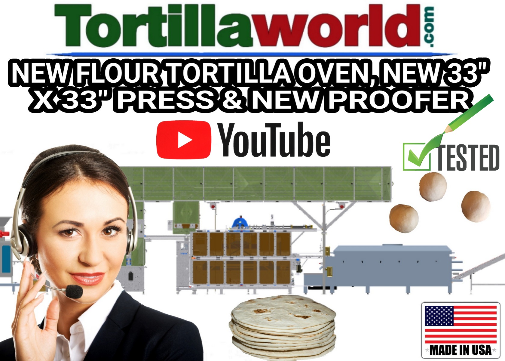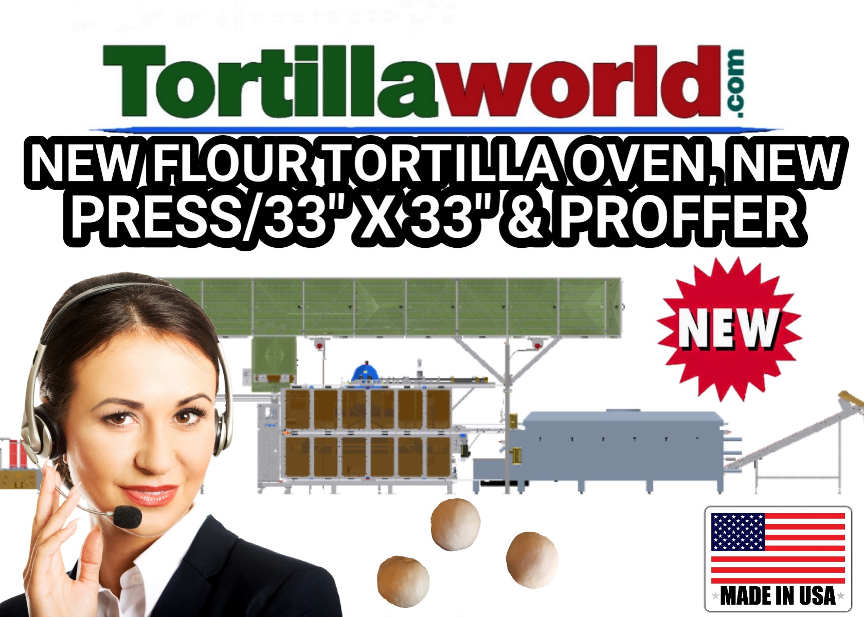 New 33″ X 33″ flour tortilla press. New flour tortilla oven, New 4, 5 & 9 drop tubes and a new 9 pocket flour tortilla proffer available for immediate sale