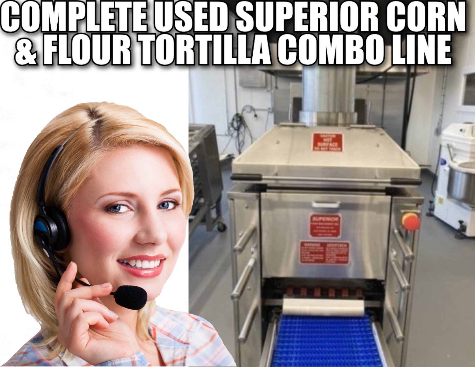 Get into the tortilla business, start small. This line has less than a month’s use. Pre-owned Superior flour/corn tortilla line. corn/flour tortilla oven, cooling conveyor, masa feeder, water meter, mixer, captive aire type 1 condensate hood. conveyor fryer, conveyor salter, U-turn conveyor, exhaust fan for hood. fryer capable of 100 lb. per hour capacity. corn tortillas: 200 to 350 dozen per hour. flour tortillas: rated 90 dozen per hour