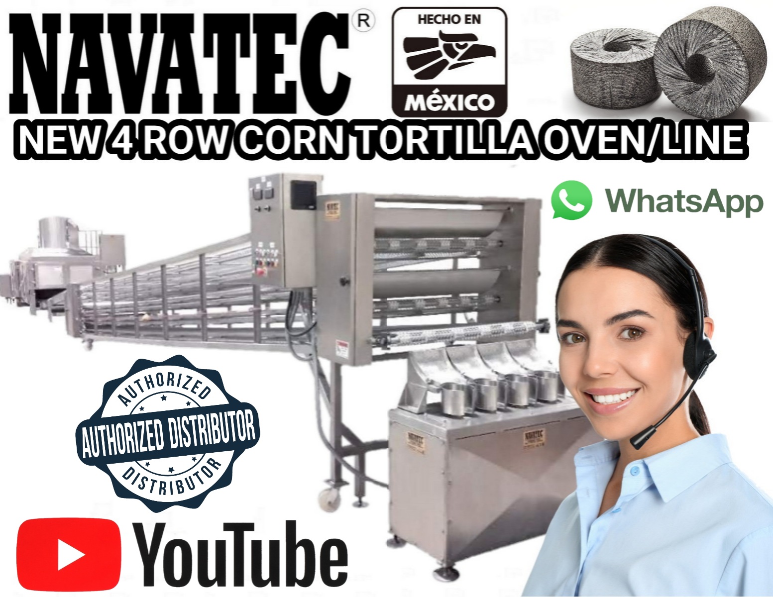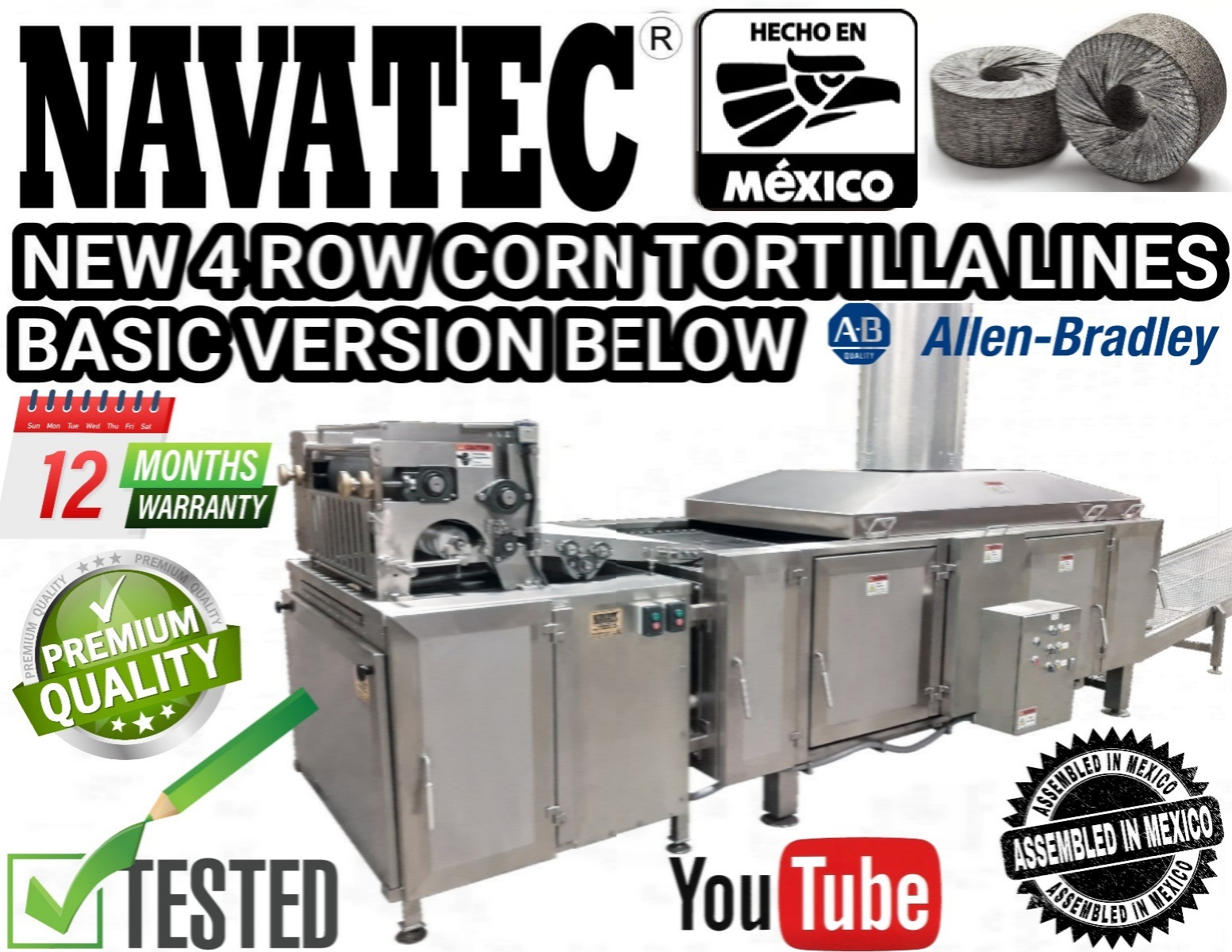 Navatec new 4 row corn tortilla line makes up to *25,000 tortillas per hour, made with 304 stainless steel including oven frame. Includes 1-2 HP. gear motor for both rollers and the in-feed conveyor with speed reducer. automatic electronic ignition system (AEIS) Independent gas control of all 3 slat belts, teflon coated 8.5″ rollers and a 5 HP. transmission motor with speed reducer for controlling the slat belt speed on 3 levels. NOTE: 3 PHASE, 60 HZ. 220 GAS: 1.3 million BTU’S Navatec can customize these ovens in a variety of sizes for standard tortilla factory operations or be designed for In-Store or Supermarket requirements