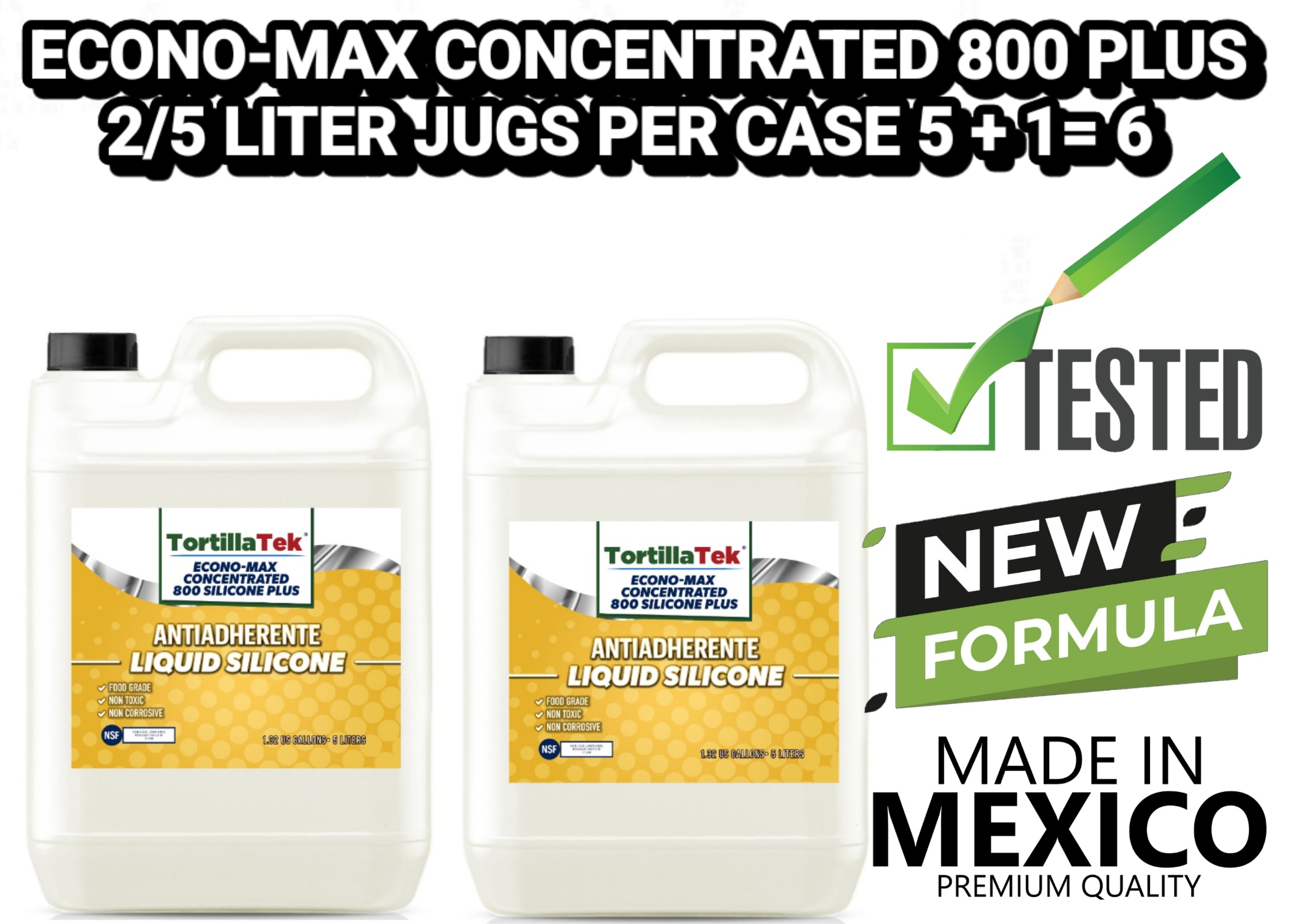TortillaTek ECONO-MAX CONCENTRADO 800 PLUS: Recomendamos diluir con agua purificada en proporciones de 5 + 1 de silicon. No es un INGREDIENTE ni un ADITIVO, es un producto quimico que crea una capa fina en los comales que evita que las tortillas se peguen. Desarrollada especialmente para  eliminar totalmente el desperdicio de tortillas, pan-plano, chapati, etc, sin alterar el color, sabor, aroma y calidad de su producto. Los ingredientes utilizados en la preparación de este producto son de origen natural y grado alimenticio segun el FDA y clasificado por la NSF como (H3) Recomendamos mantener el producto en un sitio a temperatura ambiente
